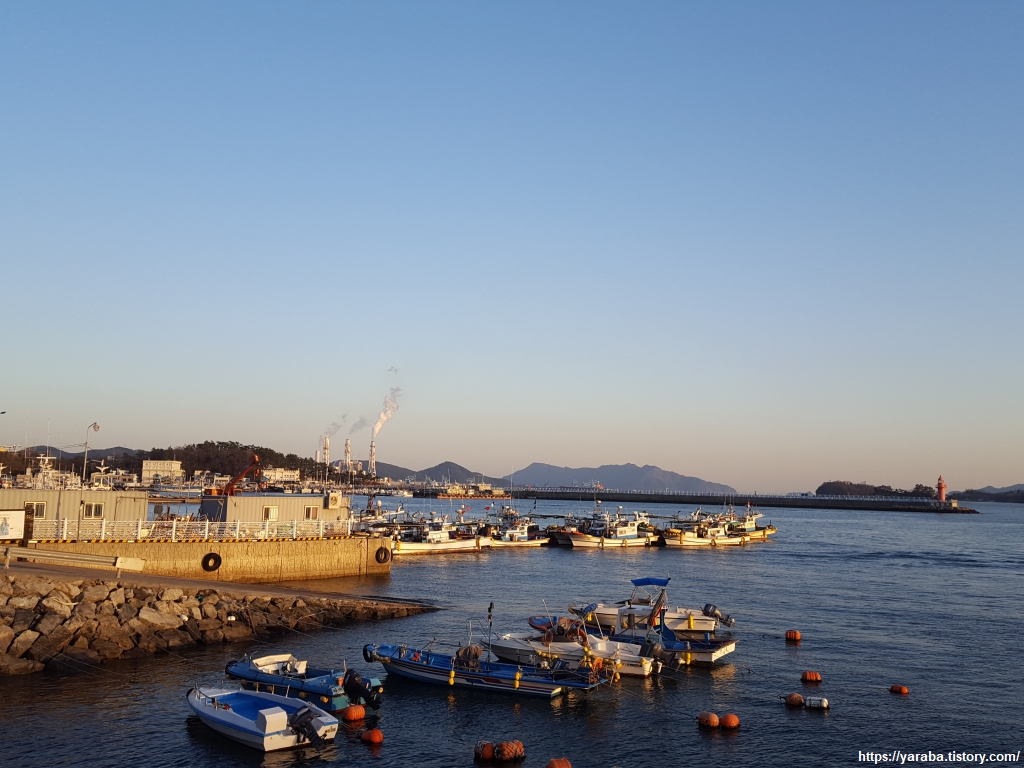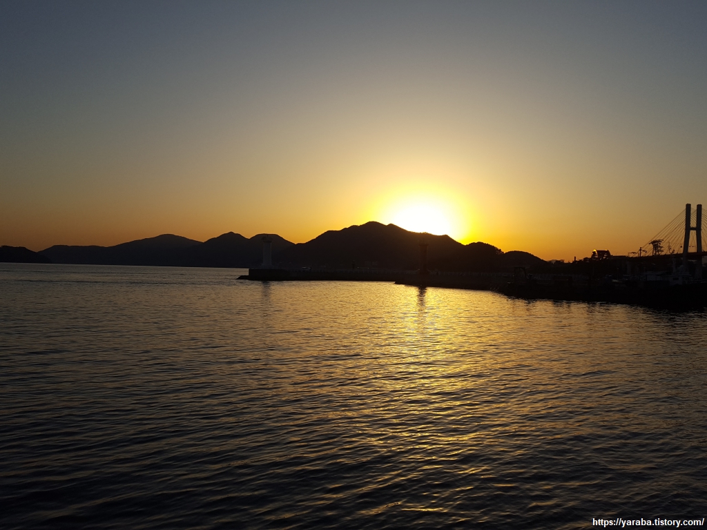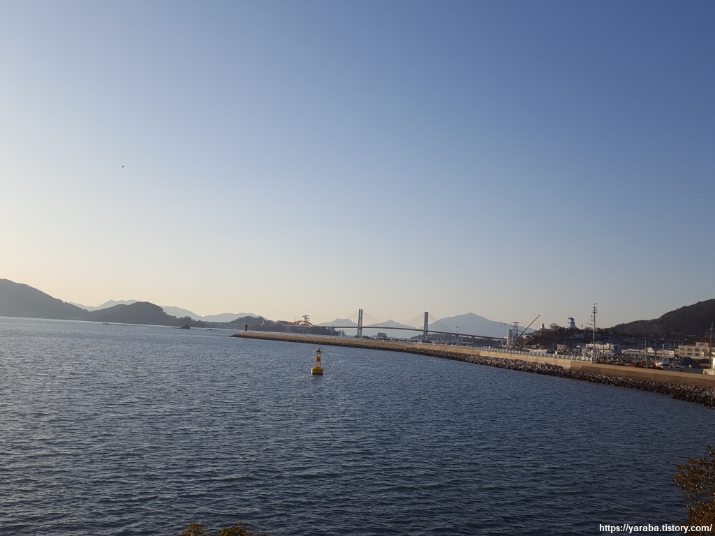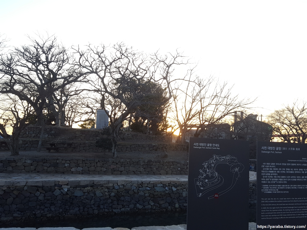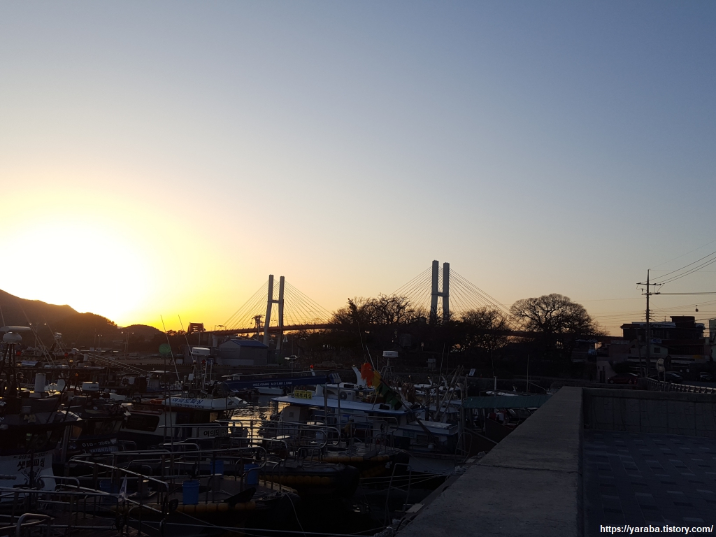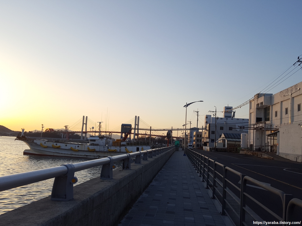 석양빛이 기막힌 조명을 비추고 있는 삼천포 대교를 보며 걷다 보니 어느덧 길은 대방진 굴항에 도착했다.
