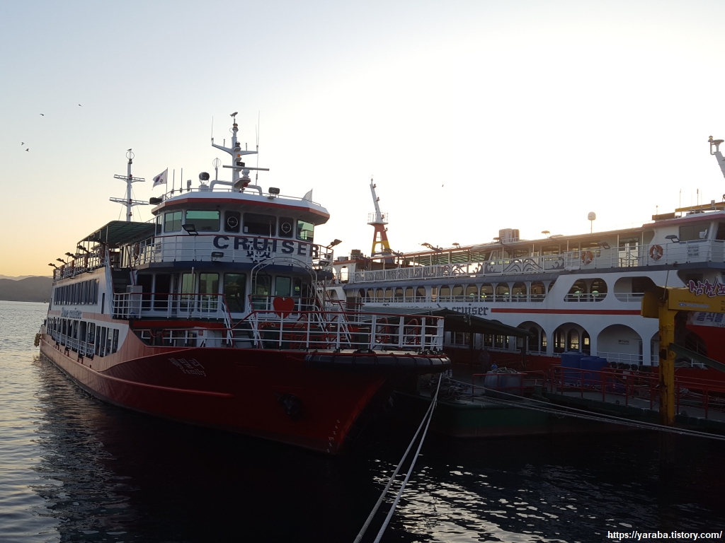 길은 삼천포 유람선 선착장 앞을 지난다. 배들이 화려하다. 최근에는 11:30, 14:00에 출항하여 창선대교, 삼천포대교를 지나 삼천포 화력발전소와 남일대 코끼리를 바위를 지나 다시 되돌아오는 1시간 30분 정도 걸린다고 한다. 우리가 걸어왔던 길이니 아쉬움은 없다.