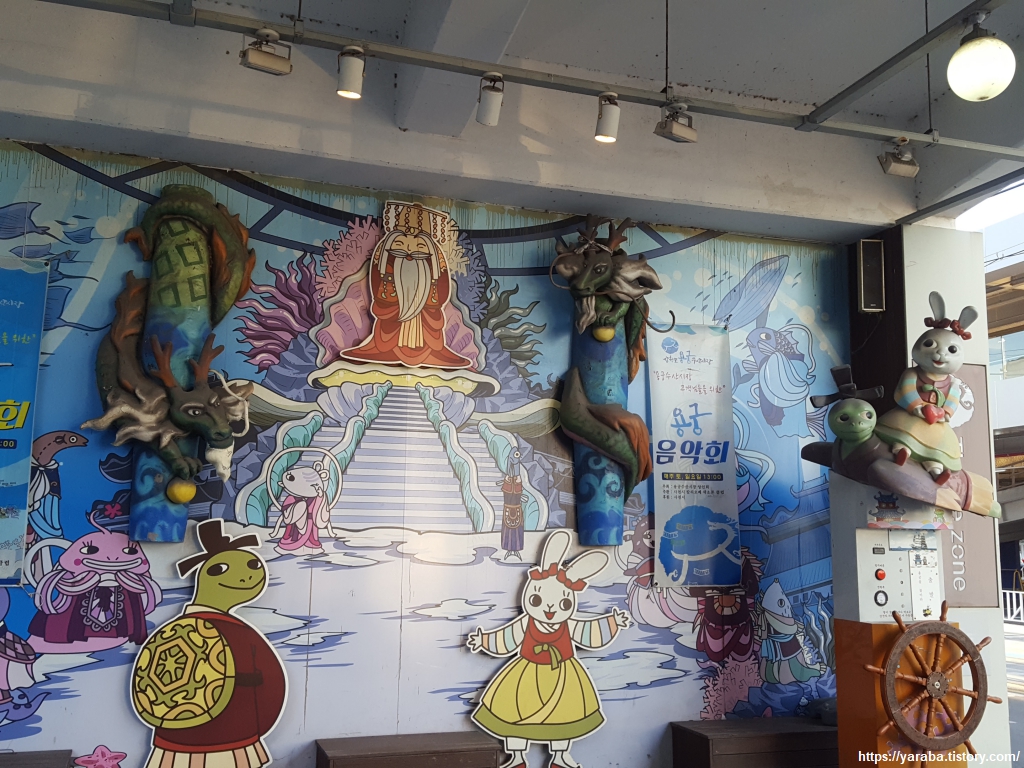 시장이름에 용궁을 넣다니! 한편으로는 우스운 생각도 있었지만 과감하다는 생각도 들었다. 벽면을 용궁 그림으로 채운 공간 한쪽에는 매주 주말마다 상인회가 주최하는 용궁 음악회가 열린다는 펼침막도 있었다.