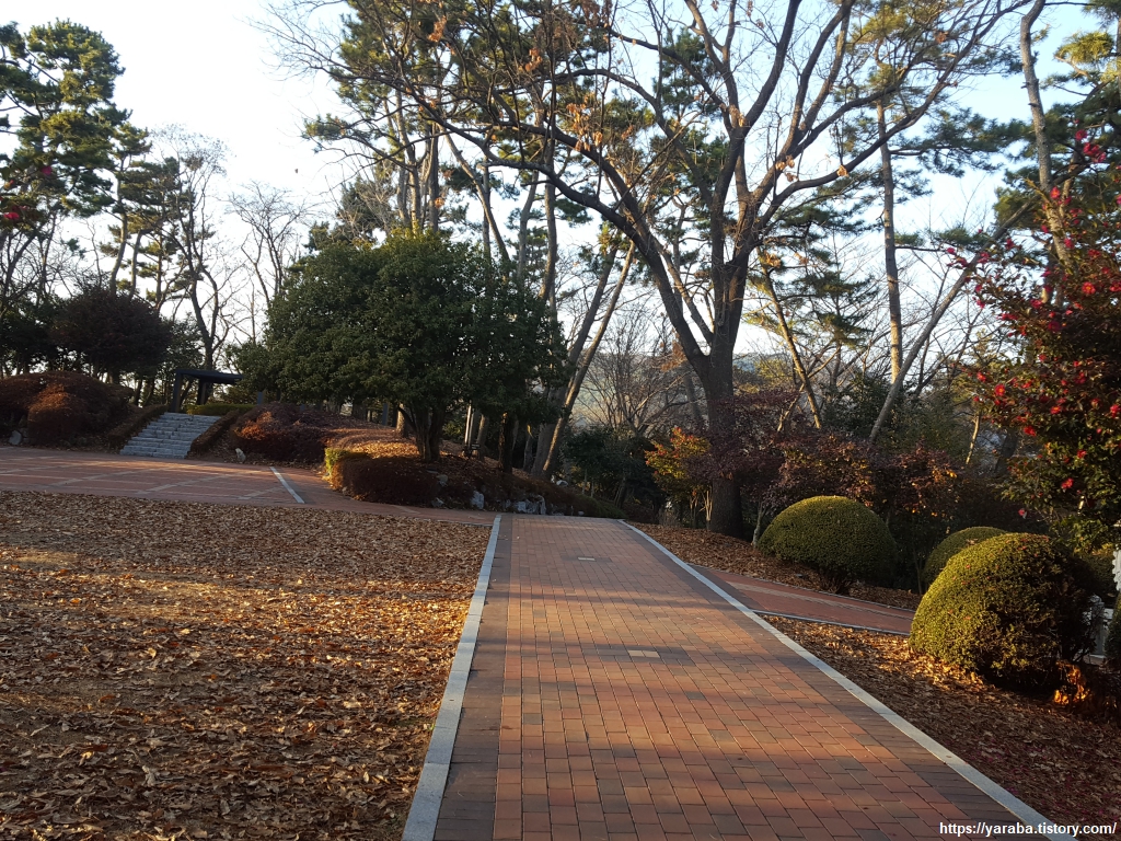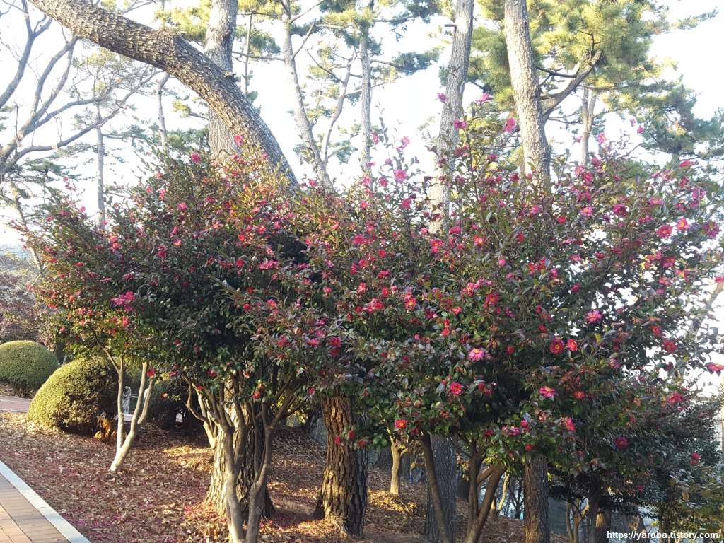 동백이 만발한 산책로를 지나 공원 입구로 향한다.