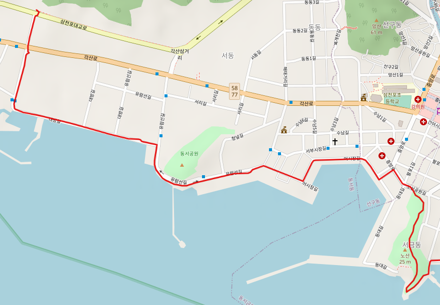 삼천포 터미널까지는 멀지 않은 거리이므로 우리는 택시로 이동하기로 했다. 기사분은 우리의 옷차림을 보더니 단박에 남파랑길을 걷고 있는 거냐고 묻는다. 추운 날씨에 고생이 많다고, 다음 코스인 각산도 좋다고 다음번에는 따뜻할 때 내려오라고 한다. 어떤 분들은 남파랑길을 택시로 가자고 하시는 분들도 있다고 하시고, 자신도 친구들과 걷기 여행을 한다는 이야기, 사천시와 삼천포시가 통합하는 과정의 이야기 등 짧은 시간이었지만 유쾌한 시간이었다.