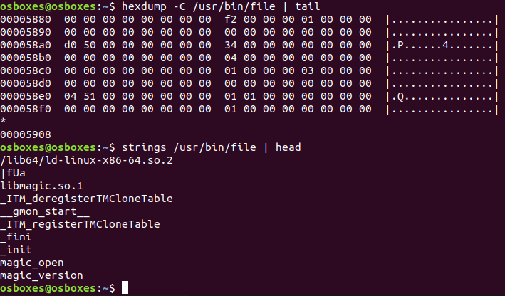 쉘 프로그램이나 단순한 텍스트 파일이라면 vi, vim. emacs와 같은 도구로 파일을 열어 볼 수 있지만, 실행 프로그램이나 데이터베이스 파일과 같은 바이너리 파일의 경우에는 텍스트 편집기로 열어 볼 수 없다. 이럴 때 사용할 수 있는 것이 hexdump나 strings 도구로 모두 사람이 인식할 수 있는 형태로 변환하거나 사람이 인식할 수 있는 문자열만 뽑아내는 도구이다. 위의 그림처럼 "-C" 옵션으로 hexdump를 수행하면 파일을 위치, 16진수 내용, 문자 내용의 형태로 표시한다. strings 도구는 그림과 같이 이진 파일에서 사람이 볼 수 있는 문자열을 차례대로 모두 뽑아낸다.