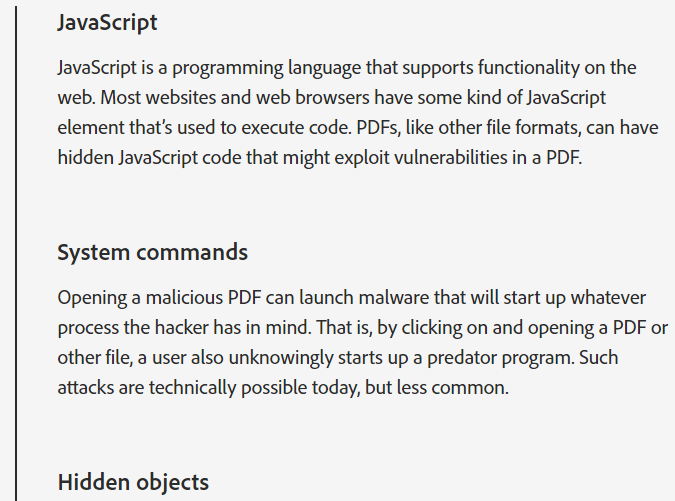 PDF 문서가 다양한 환경에서 문서 교환 방식으로 표준으로 자리 잡다 보니 PDF 통한 다양한 악성 코드 배포와 공격이 이루어지고 있는 모양이었다. 어도비사에서도 공식적으로 PDF 문서를 통해 악성코드가 배포될 수 있음을 명확히 하고 있었다.