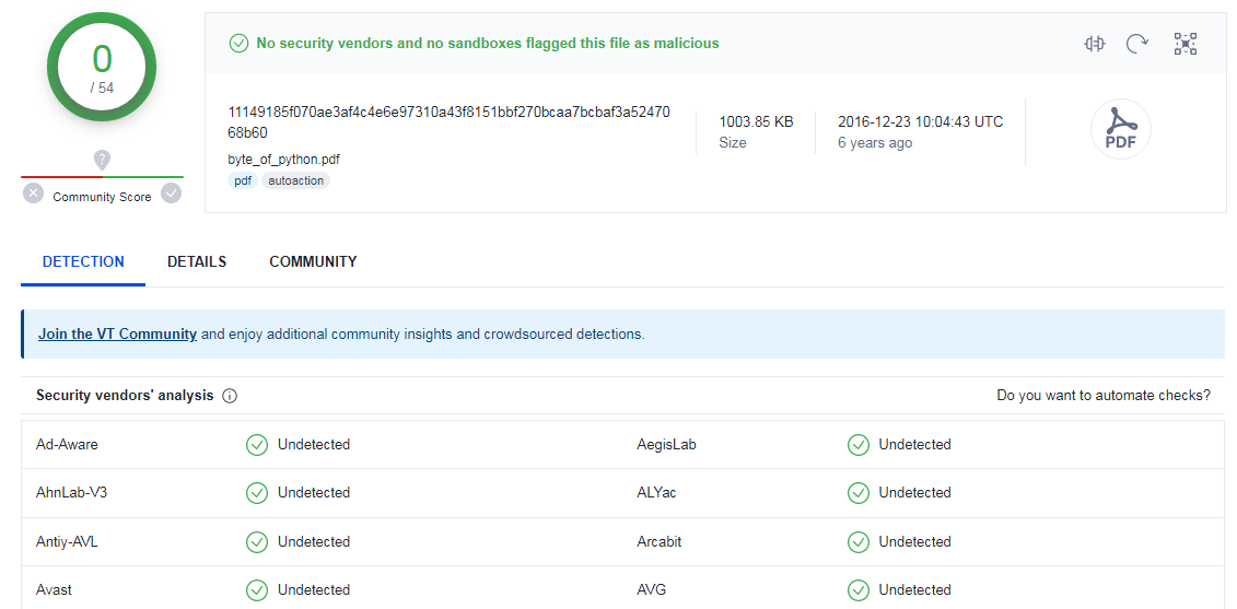 이런 경우 문제가 있는 PDF 문서를 제대로 점검해 볼 수 있는 사이트가 있었다. 물론 무료다. https://www.virustotal.com/gui/home/upload 사이트에 네이버 메일에서 문제가 있다는 파일을 업로드하여 검사해 보니 역시 문제가 있다고 나왔다. 다양한 백신 엔진으로 검사한 결과를 확인할 수 있다. 옆지기가 어딘가에서 다운로드하였다고 하는 파이썬 학습 교재인데 악성 코드가 심어져 있었던 것이다.