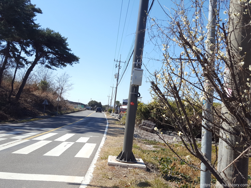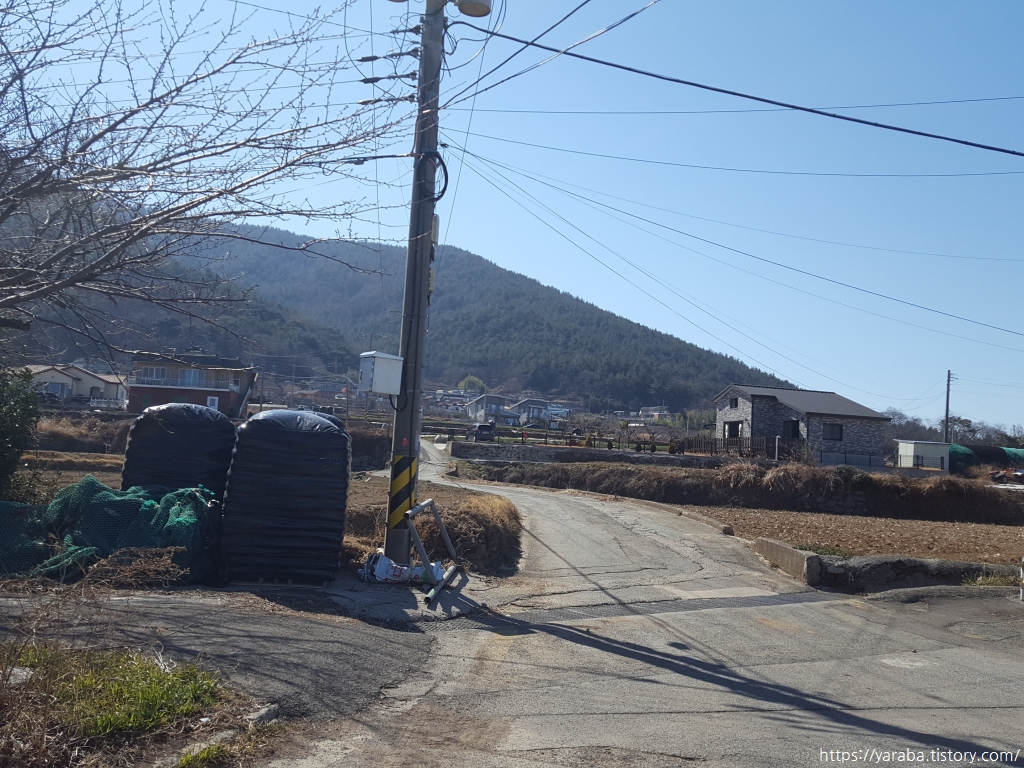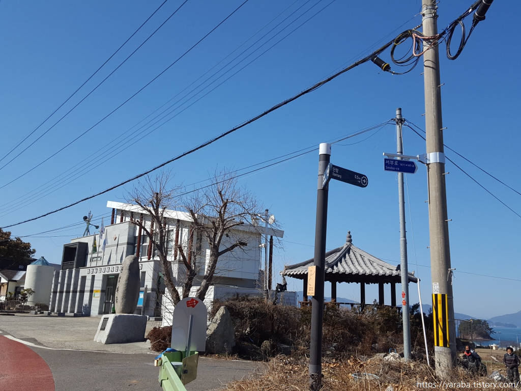 1024번 지방도 서부로 도로변을 걷던 남파랑길은 단항 마을 회관 앞에서 우회전하여 해변으로 나간다.