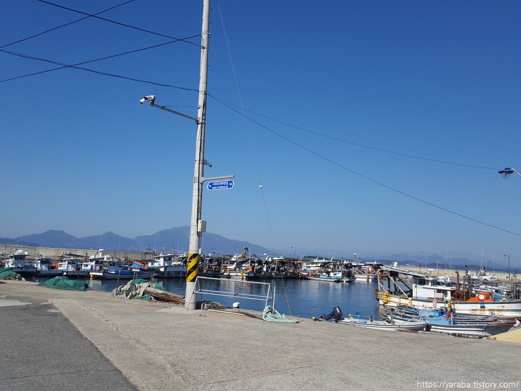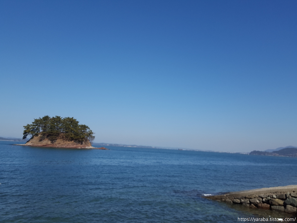 해변으로 나오니 넓게 펼쳐진 바다를 눈에 담을 수 있어 좋다. 남해도와 사천 땅으로 호수처럼 둘러싸인 바다지만 한낯 미물과도 같은 사람의 시선에는 눈을 시원하게 하는 넓은 바다이다. 정면으로는 작은 소초도가 좌측 포구 너머로는 대초도가 자리하고 있다. 지금은 물이 들어와 있지만 물이 빠지면 소초도까지 바닷길이 열리기도 한다고 한다.