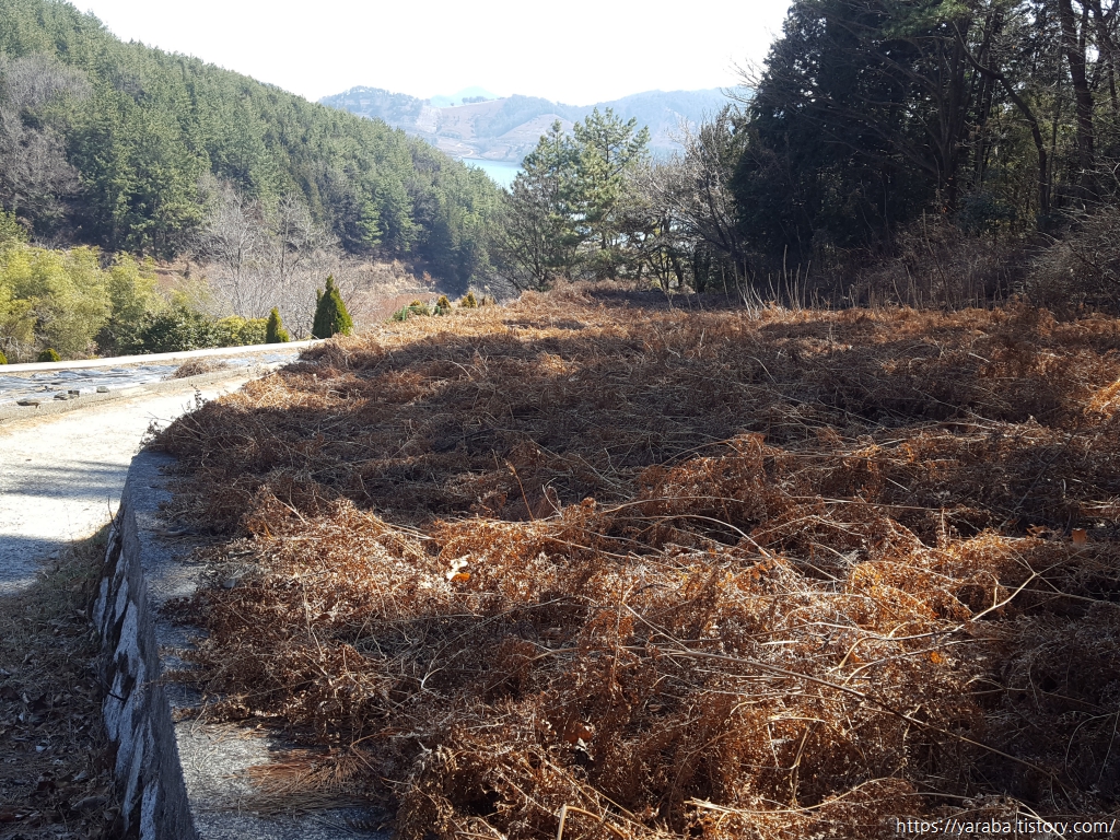 마땅히 쉴 자리를 찾지 못했는데, 고사리밭 끝의 옹벽 위에 앉아 잠시 쉬어 간다. 계곡 너머로는 온통 고사리밭이다. 고사리로 유명한 남해 창선도의 모습을 맛보기로 보여주는 모양이다. 고사리는 땅속줄기를 캐서 잘라 심는 방식으로 번식시킨다고 한다.