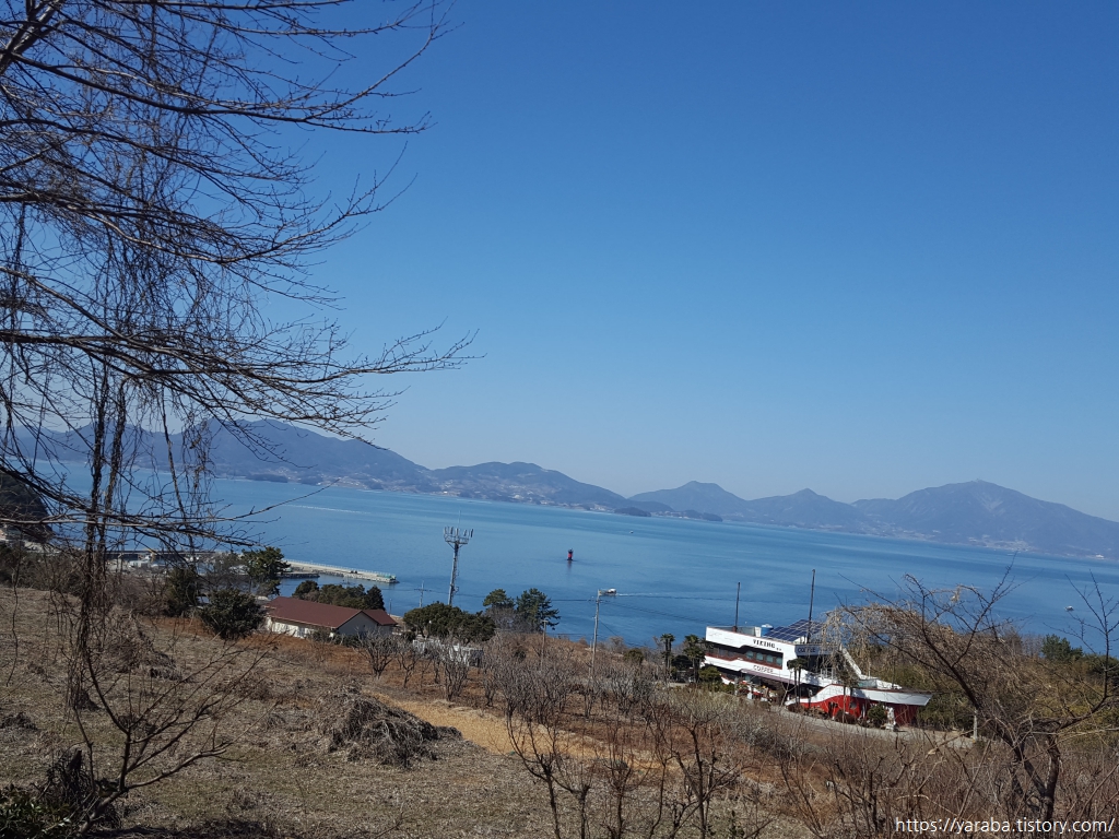 땀을 흘리며 오르막길을 얼마나 올랐을까? 산 아래로 단항 마을 앞바다와 함께 남해도도 보이고 하동 땅의 높다란 금오산도 눈에 들어온다.