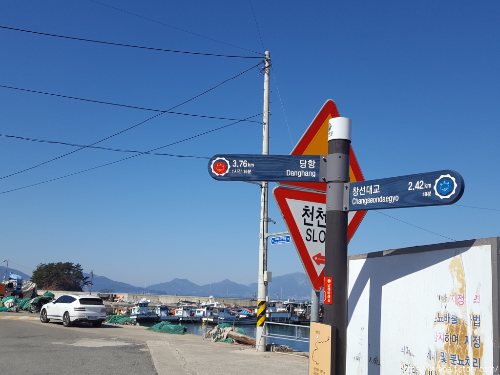 길은 단항 마을 포구에서 좌회전하여 왕후박나무를 만나러 간다. 당항 마을 표지판이 등장했다.
