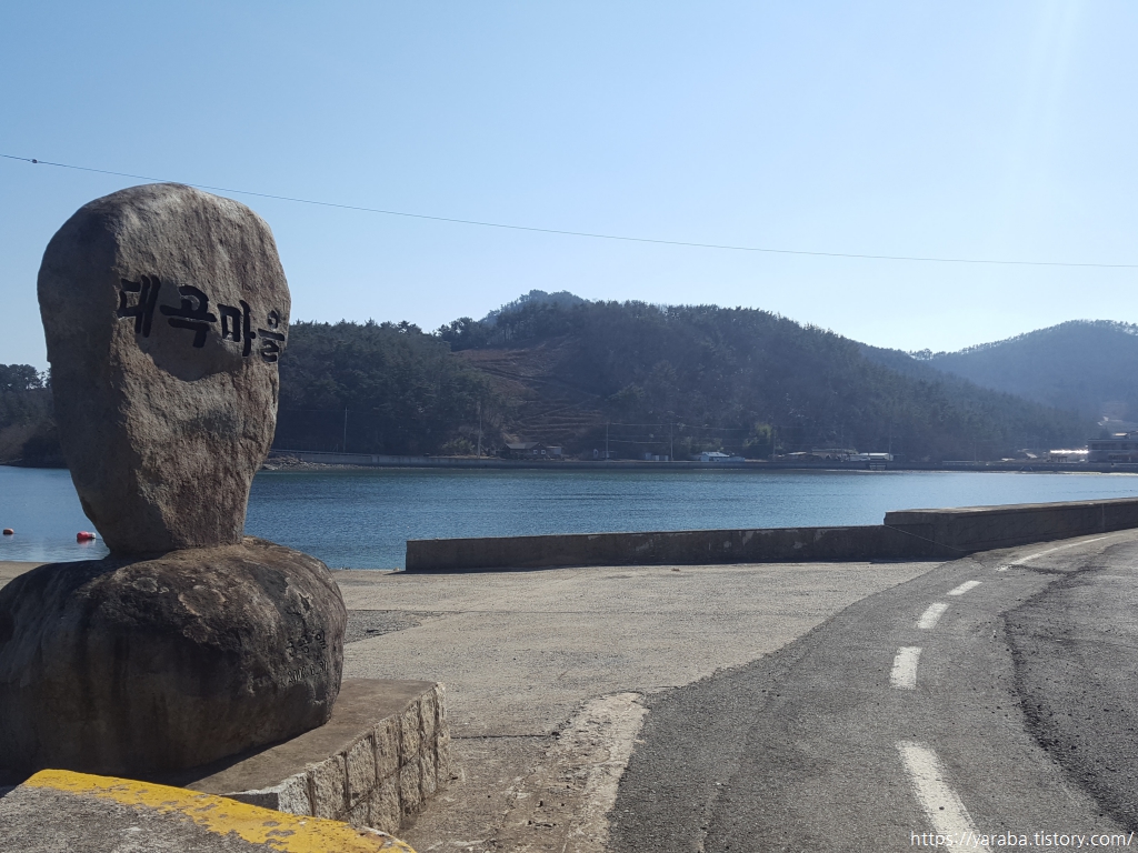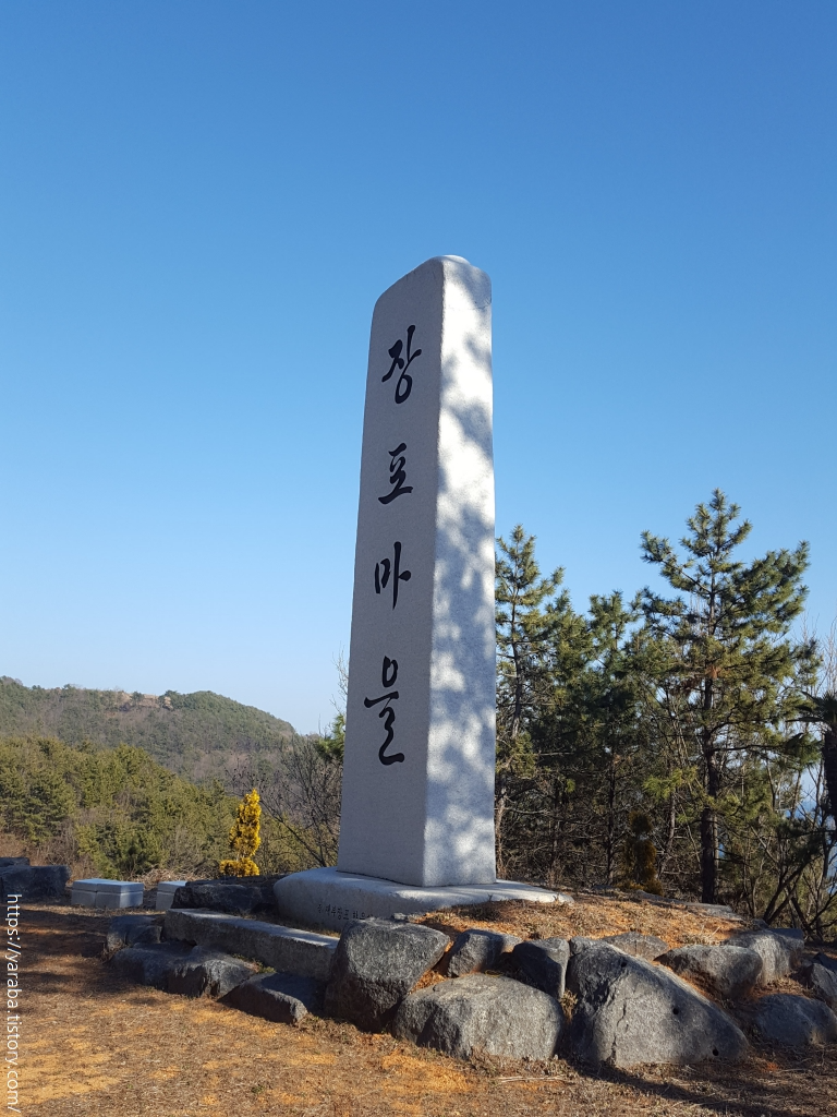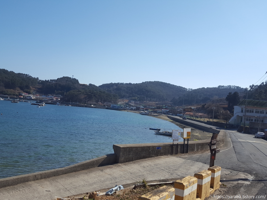 해안을 따라 완만하게 내려가는 흥선로 도로는 자동차도 많지 않고, 도로변의 갓길도 넓어서 도보로 이동하기에 위험하지 않았다. 도로 한쪽에 세워진 거대한 장포 마을 표지석. 마을 표지석 치고 이렇게 큰 표지석은 처음인 듯하다. 표지석 옆의 쉼터에서 잠시 휴식을 취하고 길을 이어간다.