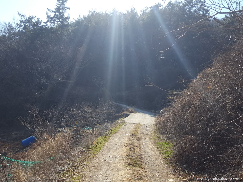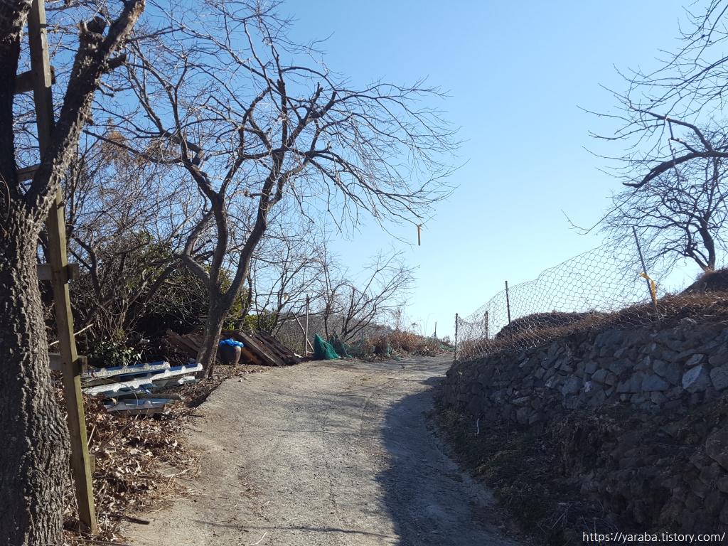 비탈을 일구고 돌을 쌓아 만든 산 중턱의 밭들을 가로지르는 농로를 따라간다.