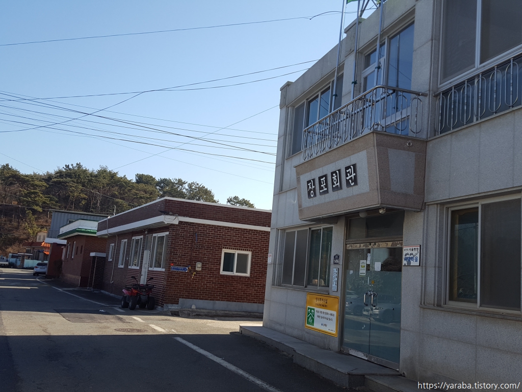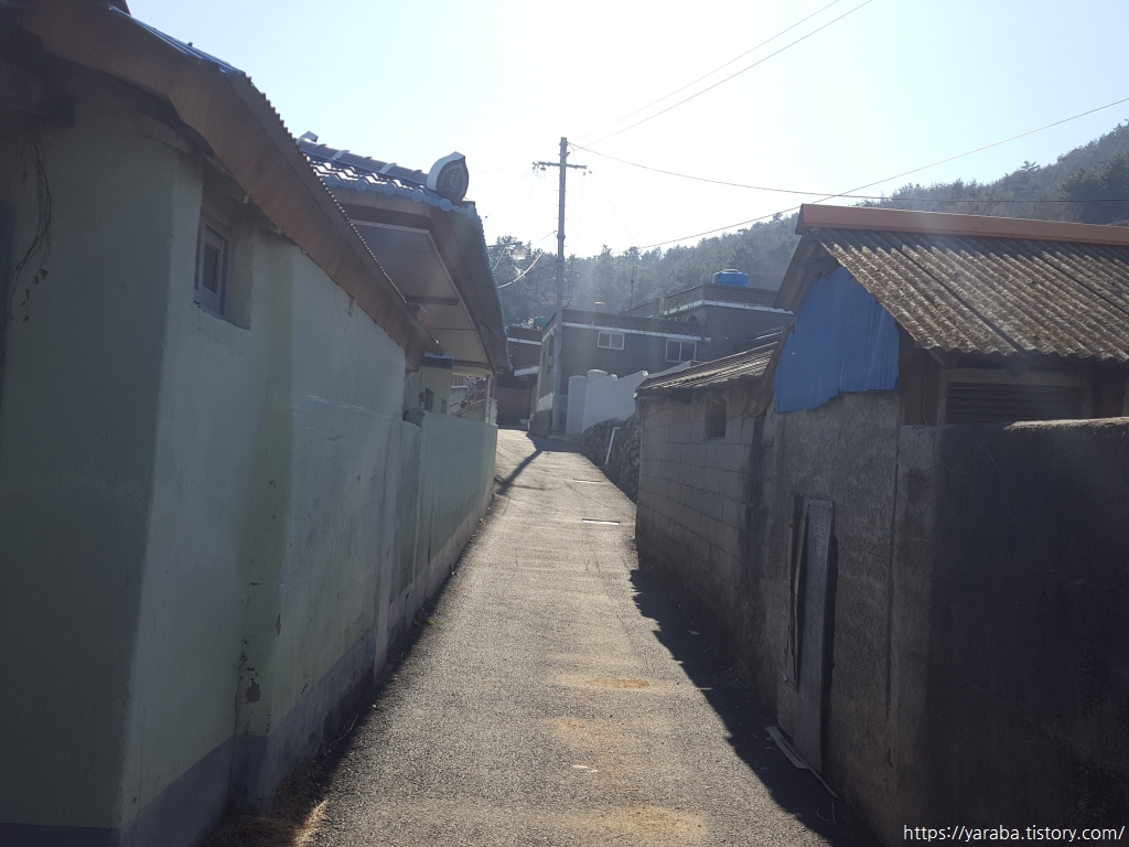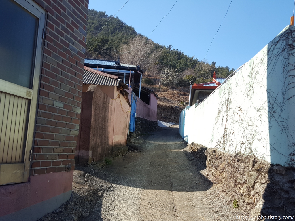 포구 공사가 한창인 장포항을 지나면 장포 마을 회관에서 우회전하여 골목길을 통해 길을 이어간다.