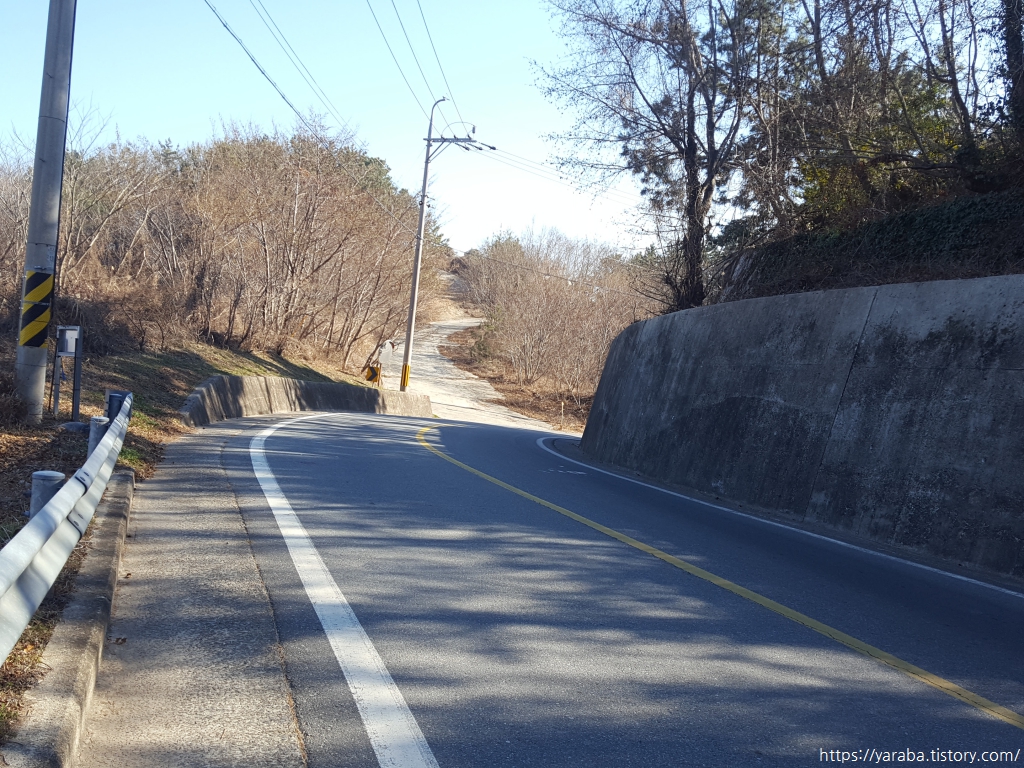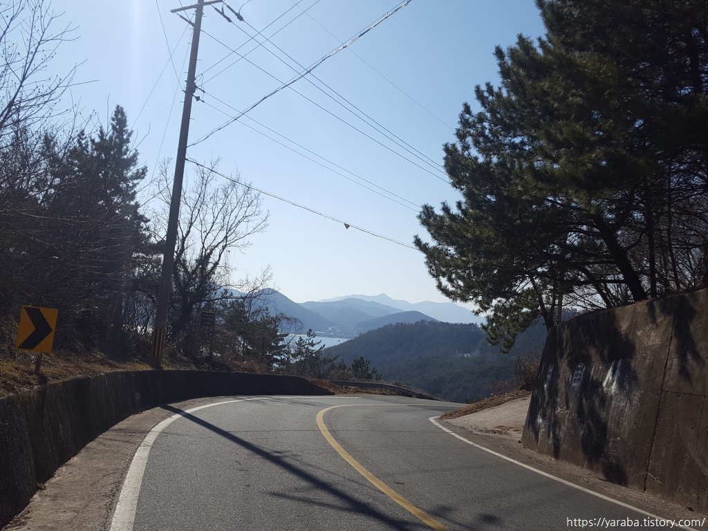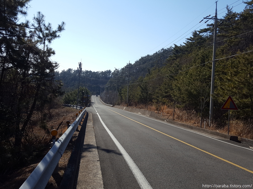 장고개를 넘어서면서 만나는 바다 풍경은 창선도와 남해도 사이의 바다이고 바다 건너편은 우리가 내일 남파랑길 39코스로 걸어갈 길이다. 문제는 이곳에서 우회전하여 임도로 진입했어야 했는데 그만 입구를 놓치고 말았다. 옹벽에 희미하지만 보현사라는 절이름도 적혀 있고 남파랑길 스티커도 붙어 있는데 그것을 보지 못했던 것이다. 돌아보면 바다 풍경을 감상하느라 놓쳤을 수도 있고, 도로 좌측으로 걸었던 까닭일 수도 있다.