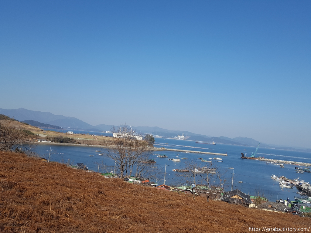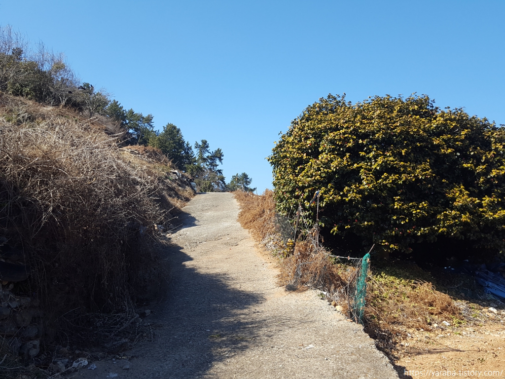 2월에 창선도에서 만나는 밭의 모습은 누런 고사리밭 아니면 푸른 마늘밭이다. 장포 마을과 장포항을 뒤로하고 계속 언덕을 오른다.