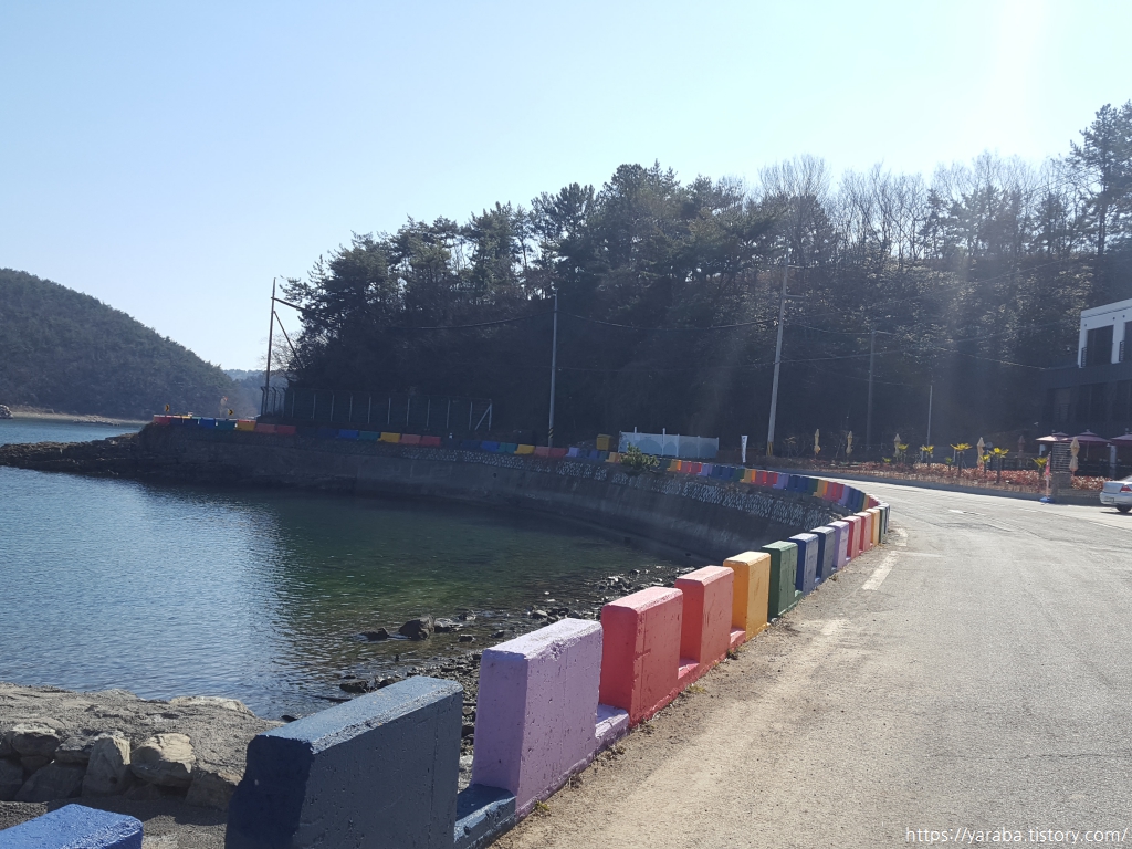 37코스를 걷는 동안 마음에 부담을 주었던 산악회 단체 여행객들은 관광버스를 타고 떠났고 이제는 옆지기와 둘만의 호젓한 시간이 이어진다. 무지갯빛으로 칠해놓은 안전 차단벽이 세워진 구불구불 해안 도로를 따라 대곡 마을로 향한다.