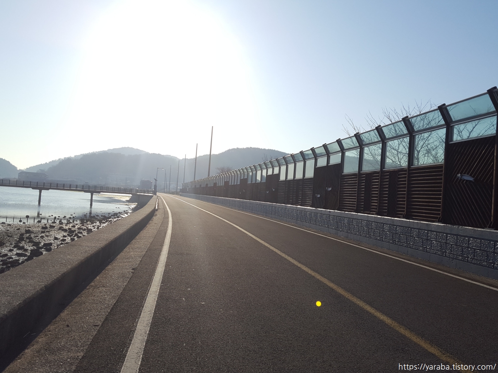 39코스는 삼동면 사무소 앞에서 좌회전하여 해안으로 나가는 것으로 시작한다. 우리가 건너온 창선교를 바라보며 해안으로 나간다. 창선교 위에서 바라보는 죽방렴 풍경은 정말 일품이었다.