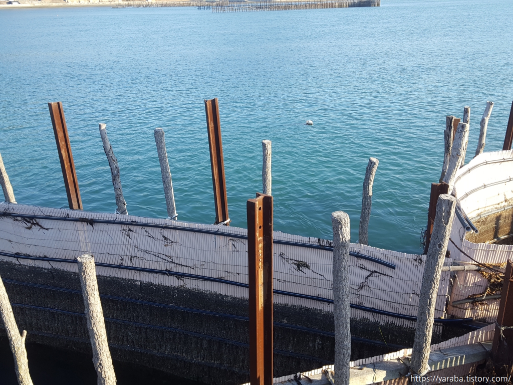 지족항의 포구를 지나가는 길, 좌측 바다로 방죽렴을 보면서 걷는다.