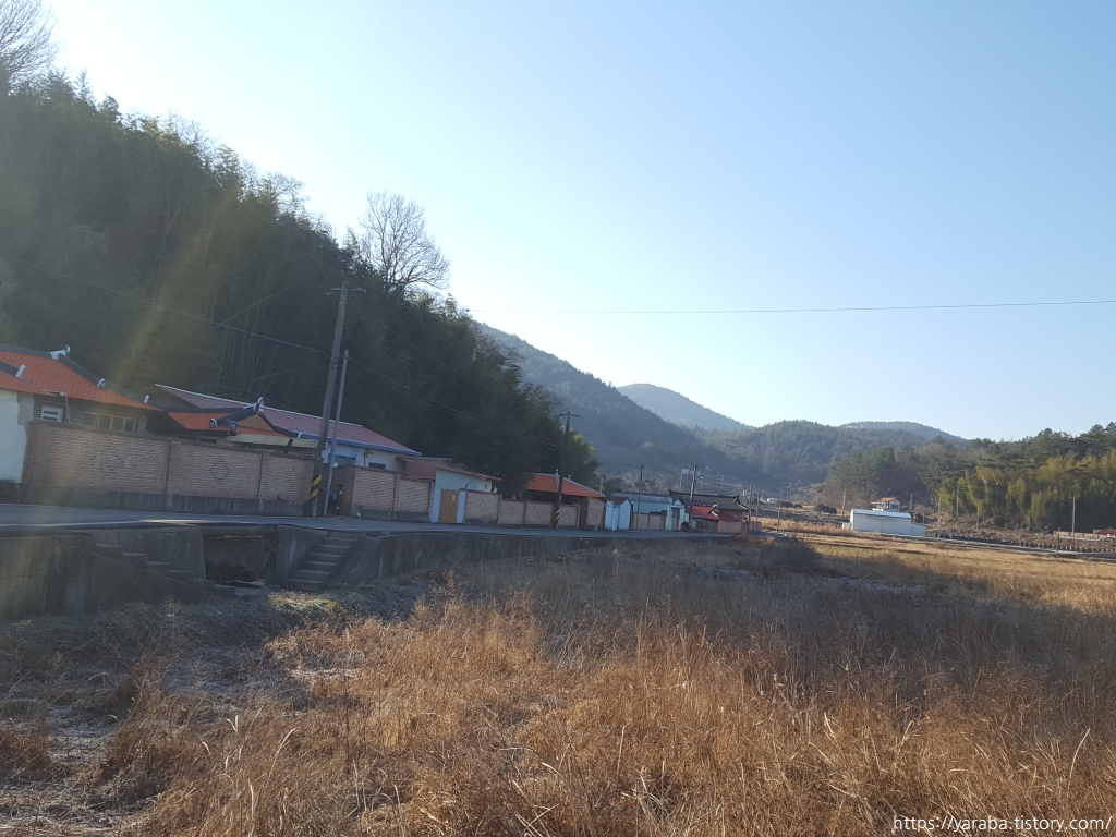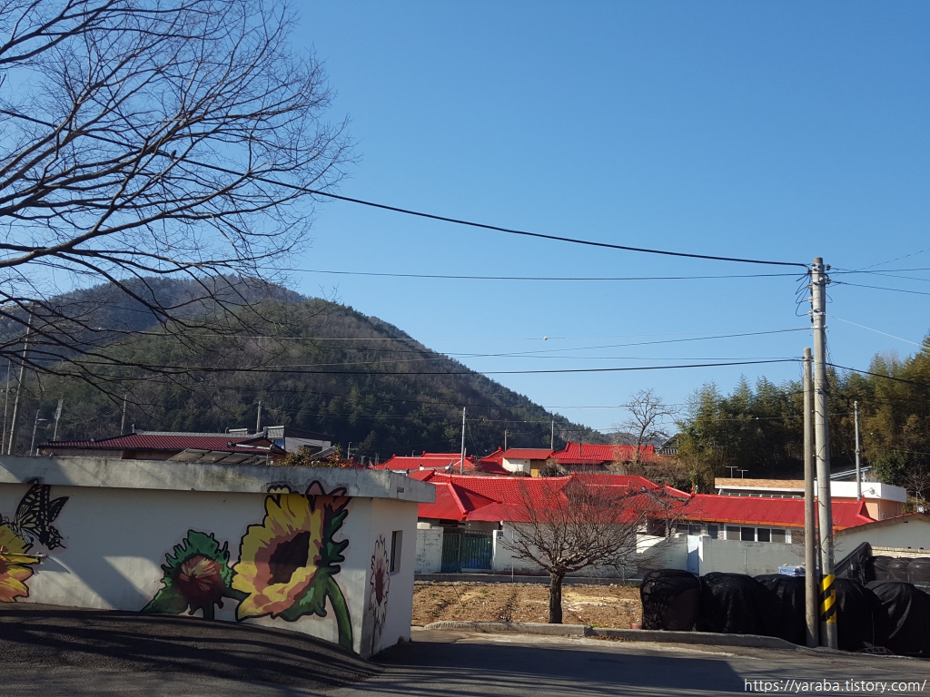 쇠두름산 아래 자락으로 마을 길과 함께 가옥들이 이어지는데 담벼락을 예쁜 벽돌로 같은 형태로 쌓아 놓았다. 동네 미관을 가꾸는데 벽화도 좋지만 같은 형태의 벽돌 담장을 쌓는 것도 좋아 보였다. 이곳뿐만 아니라 마을 전체가 벽돌 담장을 가진 특이한 마을이다. 마을에 마을 찜질방도 있으니 훌륭하다.