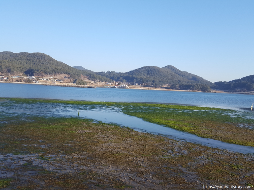 물이 빠진 갯벌에는 푸릇푸릇 파래가 존재감을 뽐낸다. 파래는 이곳 갯벌에서 자생하는 것으로 멀리 보이는 전도 마을 주민들의 소득에 일조하고 있는 것이라고 한다.
