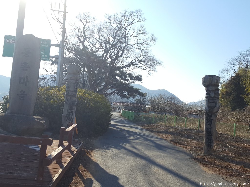 둔촌 마을에 들어선다. 천하대장군, 지하여장군이라는 말 대신에 "둔촌 사랑", "보석처럼 빛나라"라고 쓰인 장승도 이채롭고, 마을 입구의 커다란 나무들도 이 마을의 역사를 가늠케 한다. 둔촌 마을이라는 이름은 예전에 이곳에 조정으로 올라가는 곡식을 두던 창고가 있었다고 해서 붙은 이름이라고 한다.