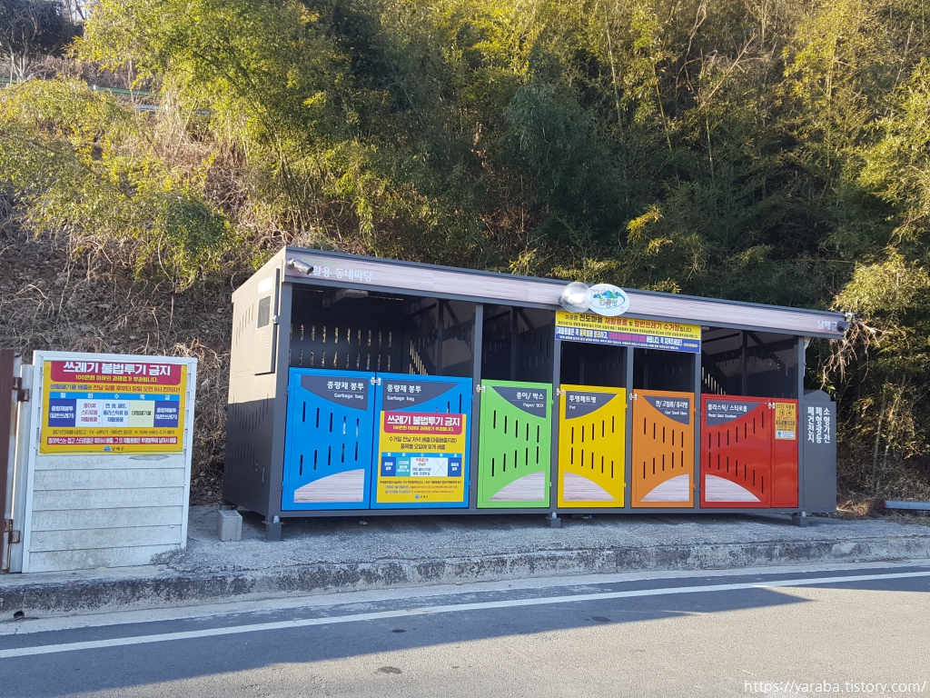 삼동면의 상징 조형물도 전도 마을 재활용품 수집함도 모두 무지개 빛깔이다. "재활용 동네 마당"이라는 이름이 붙어 있었는데, 지금까지 만난 재활용품 수집함 중에는 최고로 깔끔했다. 아무리 좋은 시설도 사용하는 사람들의 마음과 태도에 따라 전혀 다른 모양과 생명주기를 가지게 되는데 이런 깔끔한 모습들이 모든 지역으로 퍼졌으면 좋겠다.