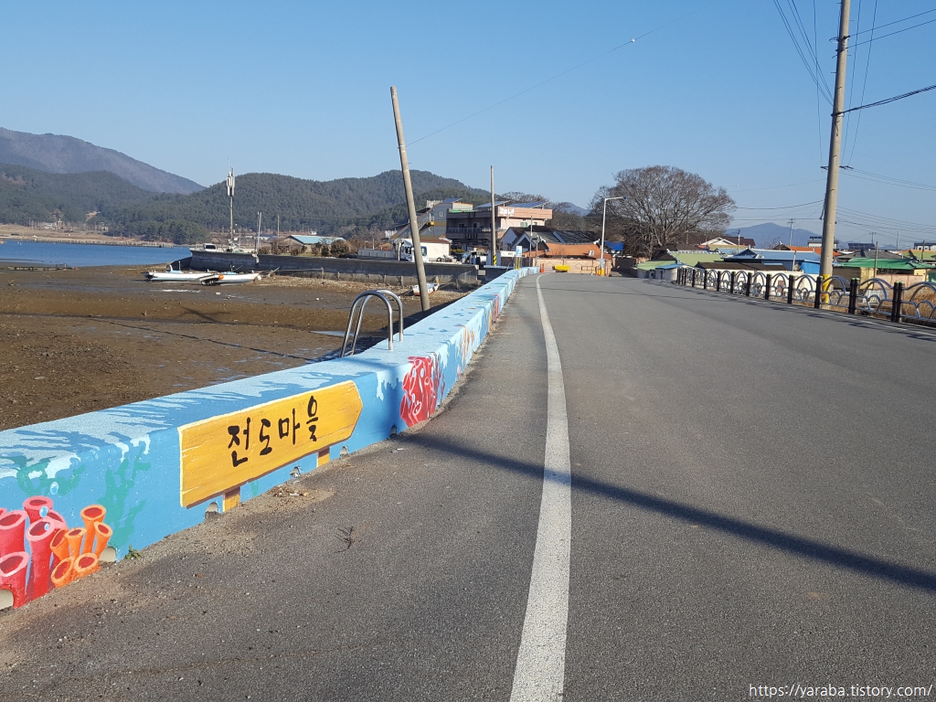 전도 마을로 들어가는 입구에는 깔끔한 그림을 그려 놓은 방호벽과 작은 습지가 여행자를 맞는다. 전도 마을이라는 이름에는 돈 전(錢) 자를 사용하고 있는데 예전에는 마음에서 소금을 생산하며 부자 마을이었다고 한다. 섬이었지만 간척으로 육지화된 마을로 명품 마을 소리를 듣고 있는 마을이다.