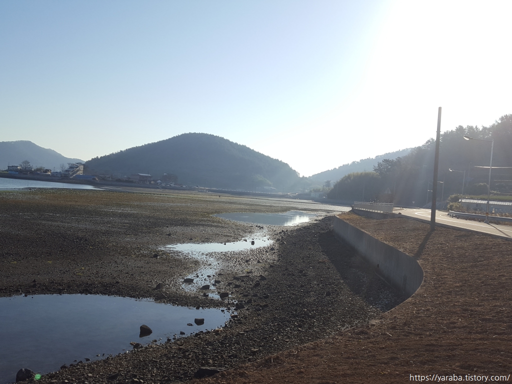 잠시 멈추어 서서 우리가 어제 걸어왔던 창선도 바다와 물이 빠지며 존재를 드러낸 갯벌을 바라본다. 이른 아침부터 감성 충만이다.