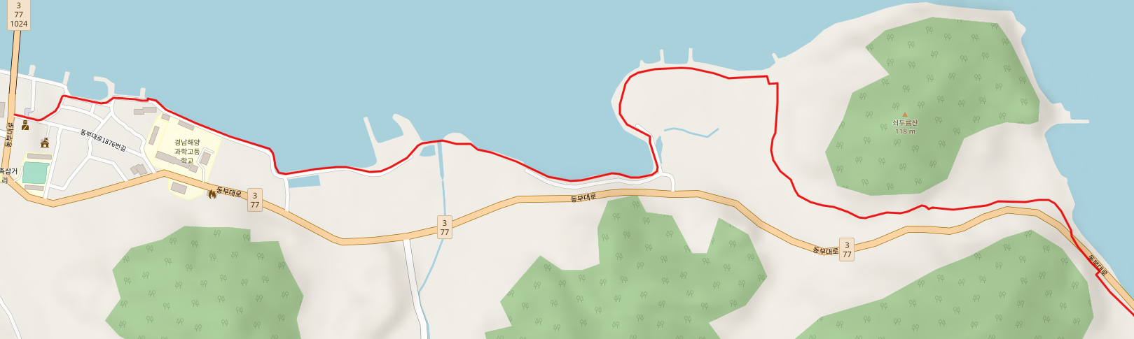 창선도와 남해도 사이의 환상적인 죽방렴 풍경을 보면서 남해도로 넘어온 남파랑길은 남해도의 우측 하단에 있는 삼동면을 먼저 걷기 시작한다. 시계 방향으로 남해도를 돌아간다. 오늘은 39코스와 40코스에 이어서 41코스 일부도 걸어야 하는 쉽지 않은 여정이다. 창선교를 지나 좌회전하면 바로 삼동면 사무소가 위치하고 있는데 길은 해안으로 나가서 해안을 따라 이어지는 해안도로를 따라서 죽방렴도 지나고 전도 마을을 지나 둔촌 마을에 이른다.