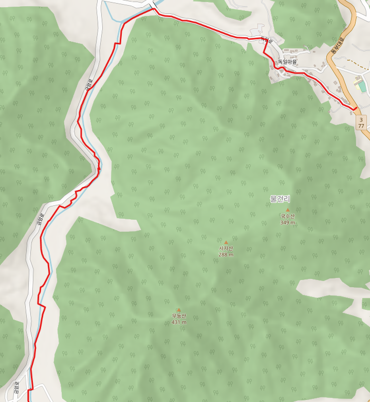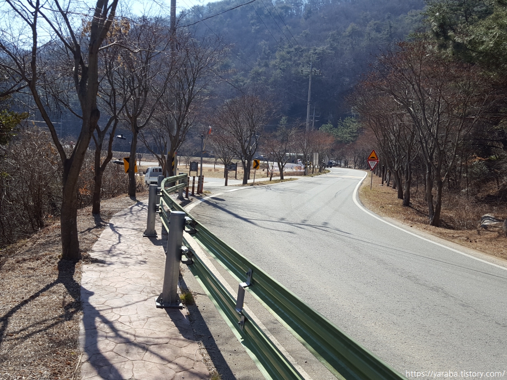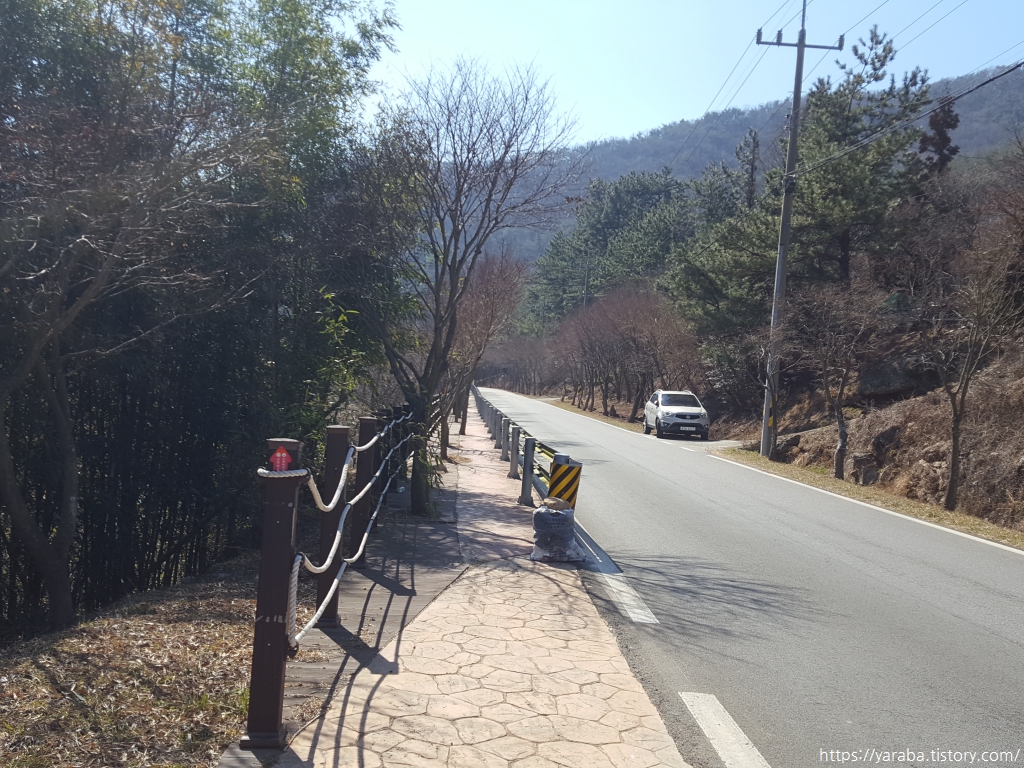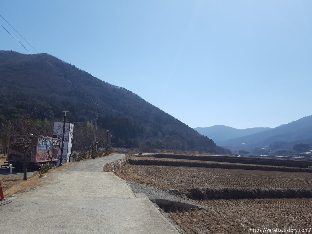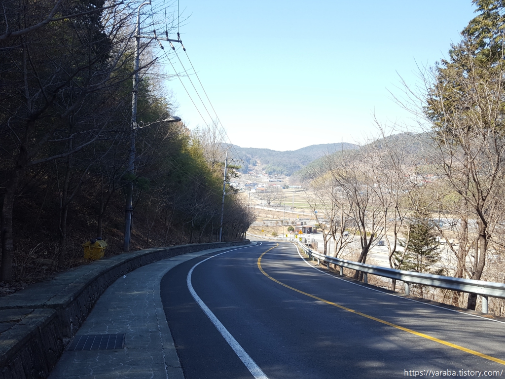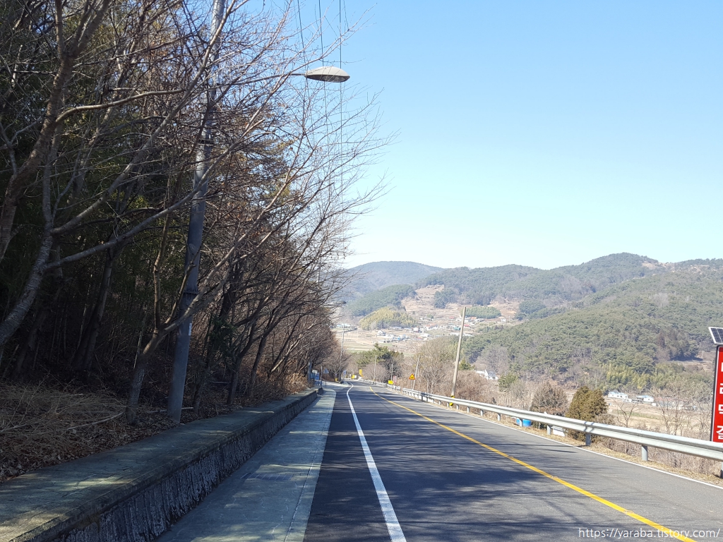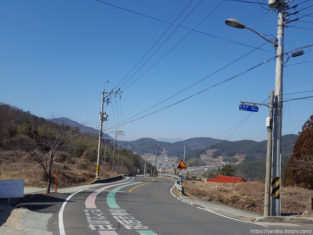 독일 마을의 고개를 지나 봉화 2리로 가는 독일로 도로변 걷기는 도로를 따라 걷기는 하지만 넓은 갓길 덕분에 편안하게 길을 이어갈 수 있는 곳이다. 터덜터덜 걸어도 발이 자연스레 걸어지는 경쾌한 내리막길이다.