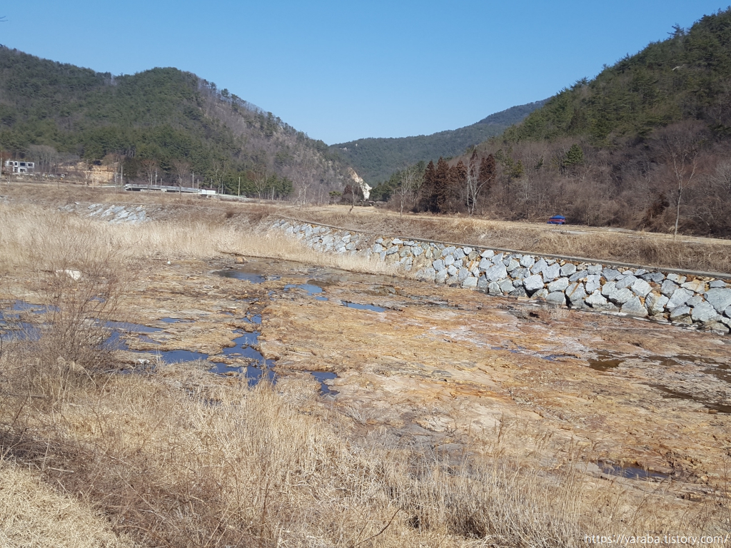 바닥이 드러난 하천 바닥을 보니 온통 바위 투성이다.