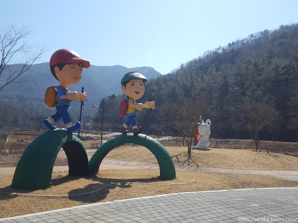 꽃내 둔치에 만들어진 공원에는 웃음 별곡이라는 이름을 붙여 놓았다. 화천 꽃내 별천지 계곡, 이름도 훌륭하고 풍경도 훌륭하다. 유배 문학을 보고 느끼는 곳이라는 안내 문구가 있었다. 남해로 유배온 2백 명이 넘는 문학가들을 기념하는 남해 유배 문학관도 있으니 유배 문학이라는 말이 그냥 나온 말은 아니다. 바위 절벽을 바라보며 서 있는 대형 인형을 멀리서 보니 진짜 사람 같다.