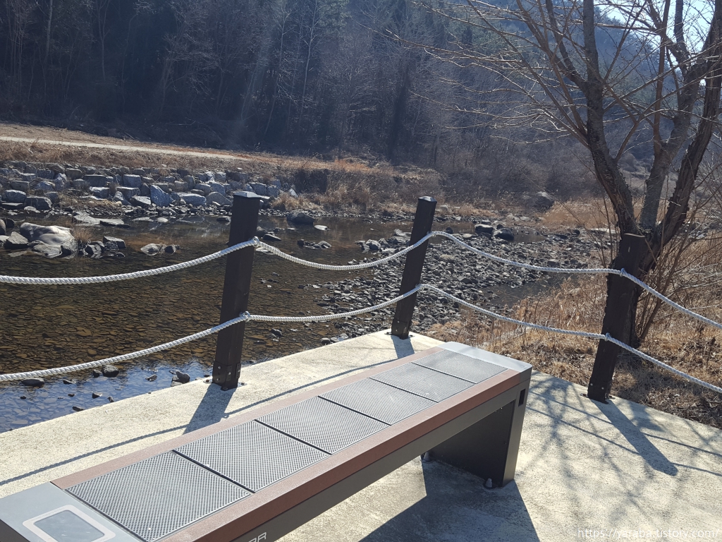하천 건너편 산책로에서 길을 이어가는데, 잘 정비된 산책로에는 쉬어 갈 수 있는 벤치도 있었다. 앉는 자리에 태양광 발전 블록이 있어 발전을 할 수 있는 벤치로 배터리에 저장한 전기는 조명이나 USB 충전으로 활용할 수 있었다. 우리와 같은 걷기 여행자에게는 쉴 자리로도 좋고 쉬는 동안 충전도 할 수 있으니 매력 만점의 의자였다. 2월 말이라 그런지, 강렬하게 내리쬐는 햇빛을 즐겁게 맞으며 잠시 쉬어간다.