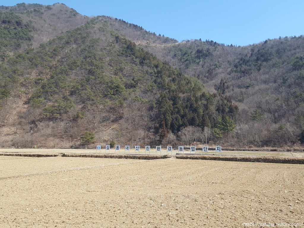 건너편 둑방길로 넘어오니 삼동 내산 친환경 농업 단지 표지판과 함께 경지 정리가 된 넓은 논들이 이어진다. 무농약으로 벼를 재배한다고 한다. 바로 위로는 내산 저수지도 있고 사람들이 많이 찾아오는 관광지도 있으니 깨끗한 환경에서 벼를 재배할 수 있는 좋은 조건을 갖추었다. 우렁이로 제초제를 사용하지 않고 유기질 비료와 쌀겨를 사용하는 친환경 농업을 한다고 하니 농민도 살고 환경도 지키는 모습이 보기 좋다.