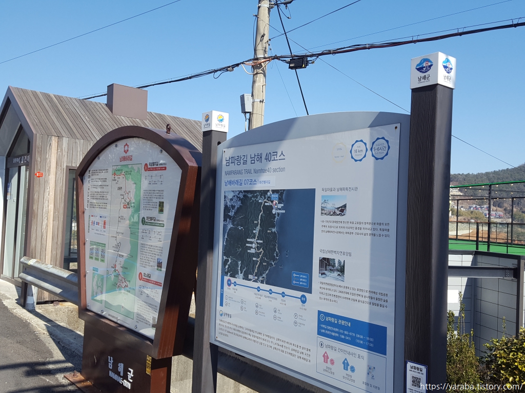 물건 마을 정류장 옆에 세워진 남파랑길 표지판을 보고 표지판 앞의 길을 건너 독일 마을로 진입한다. 남해에 들어서면서 만난 남해 바래길 표지판은 이제 남파랑길과 형제처럼 보인다.