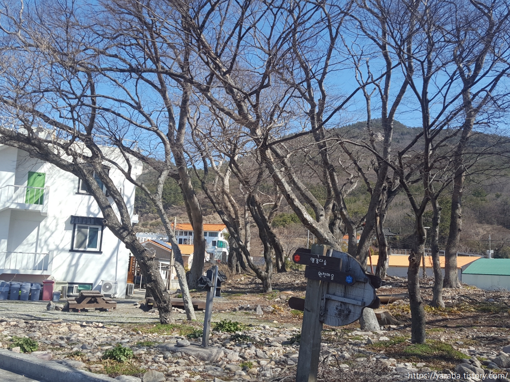 원천 마을의 해변길은 올망졸망한 펜션들과 커다란 덩치로 마을을 보호하고 있는 방풍림이 이어진다. 많은 경우 소나무 방풍림이 대부분이지만 활엽수가 마을을 지키고 있는 모습은 남해라서 가능할까? 하는 생각을 해본다.
