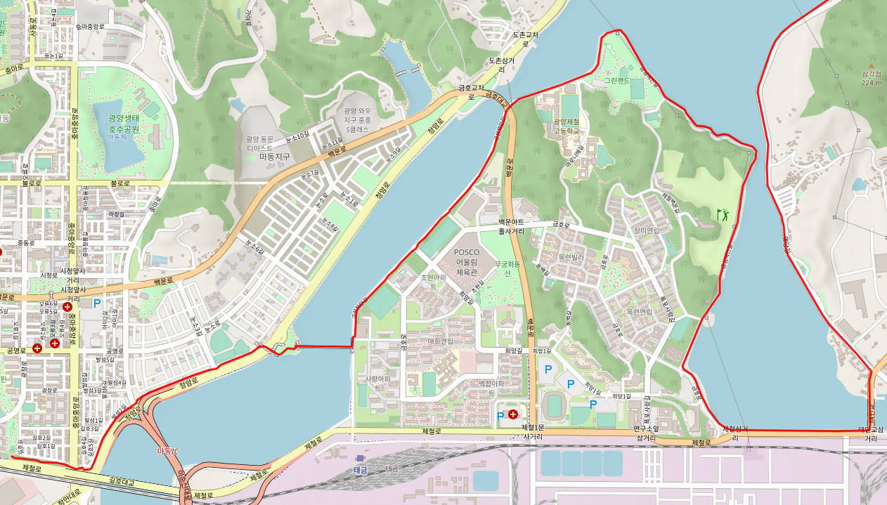 해안을 걷던 남파랑길은 깊게 파인 만의 안쪽으로 들어가며 장내 포구를 지나 포스코 광양 체철소 본부(7.9Km) 앞을 지난다. 제철소 앞을 지나면 광양 제철 주택 단지 외곽을 돌아서 중마 금호 해상 보도(10.1Km)를 건너 중동 근린공원에서 여정을 마무리한다. 오늘의 숙소는 중마 터미널 인근에 있는 "광양 에이"로 경로에서 1Km 정도의 거리에 위치한다. 숙소 인근에 식당과 편의점은 넉넉한 편이다. 숙소 인근에 김밥집도 세 군데나 있다.