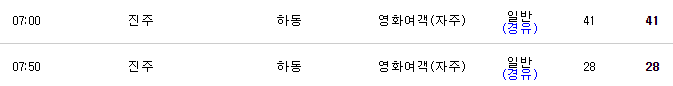 대전에서 진주로 가는 버스 편과 진주에서 하동으로 가는 버스 시간은 위의 그림과 같다.