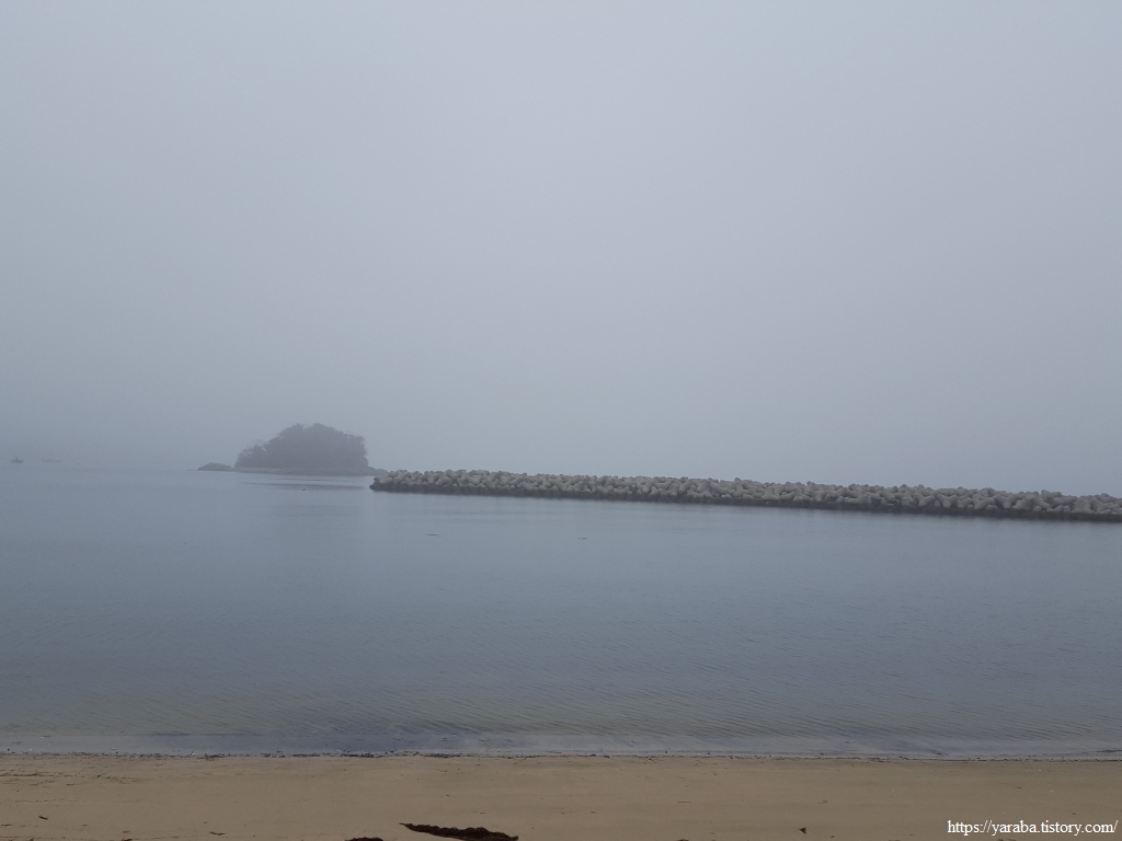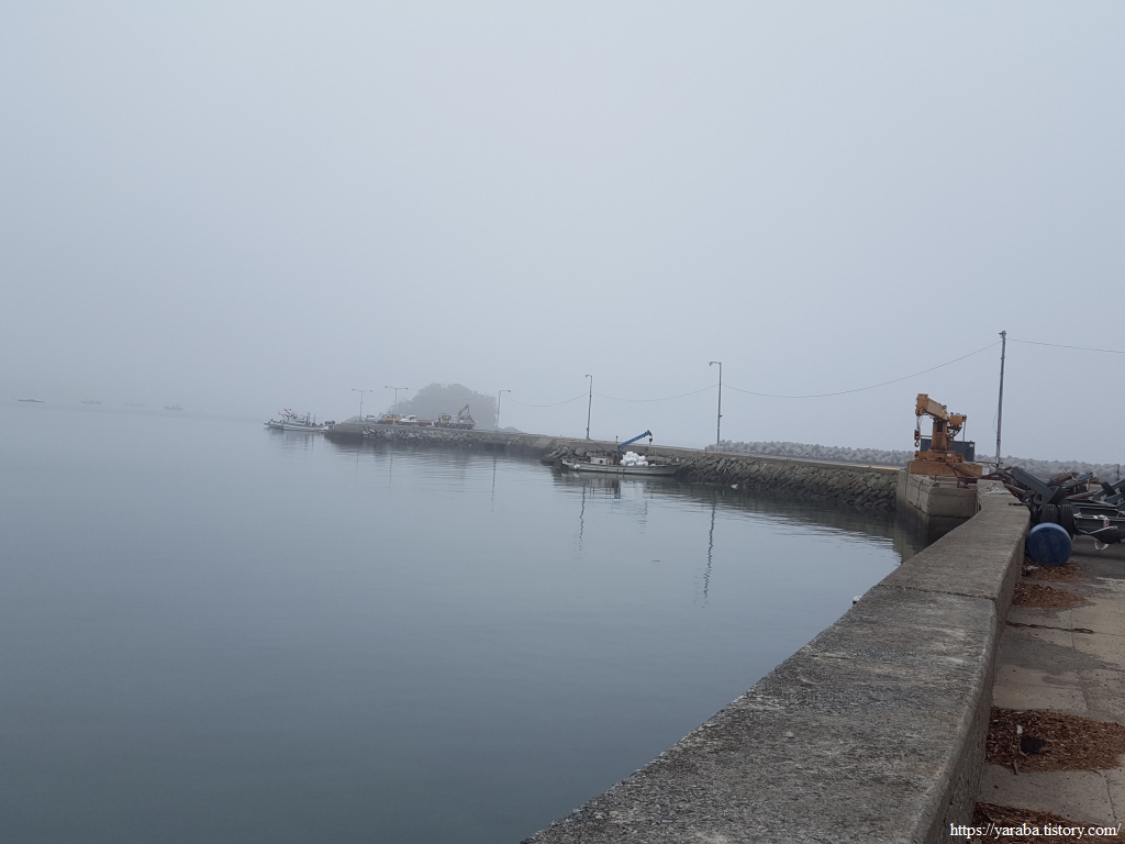 해무로 화계 마을 포구 앞에 있는 목단도가 겨우 보일 정도다. 이 풍경을 보니 아이들 어렸을 때 전북 부안에 있는 위도로 가족 여행을 갔던 추억이 떠오른다. 국가가 방사능 폐기물 처리장을 설치하려다가 주민들 반대로 무산된 섬이다. 재미있게 놀다가 집으로 돌아가야 하는데 해무가 하루 종일 걷히지 않아서 집으로 가지도 못하고 회사에 전화로 휴가를 내고 의도하지 않은 강제 휴가를 보내야 했었던 곳이다. 해무를 만나니 추억이 새록새록하다.
