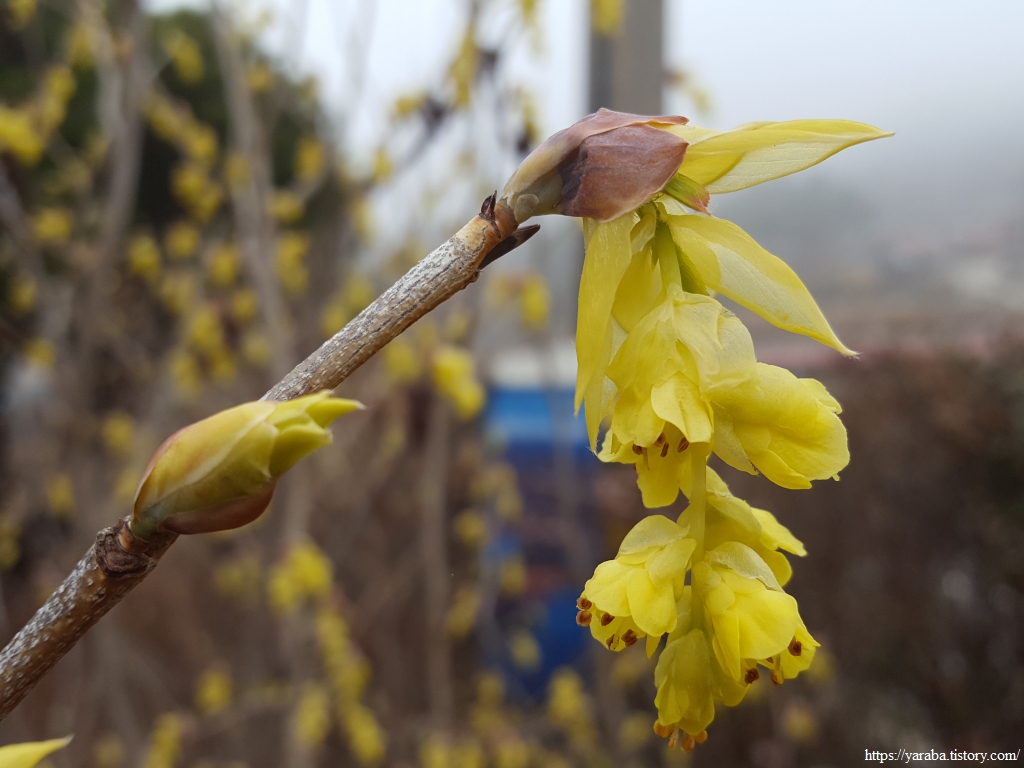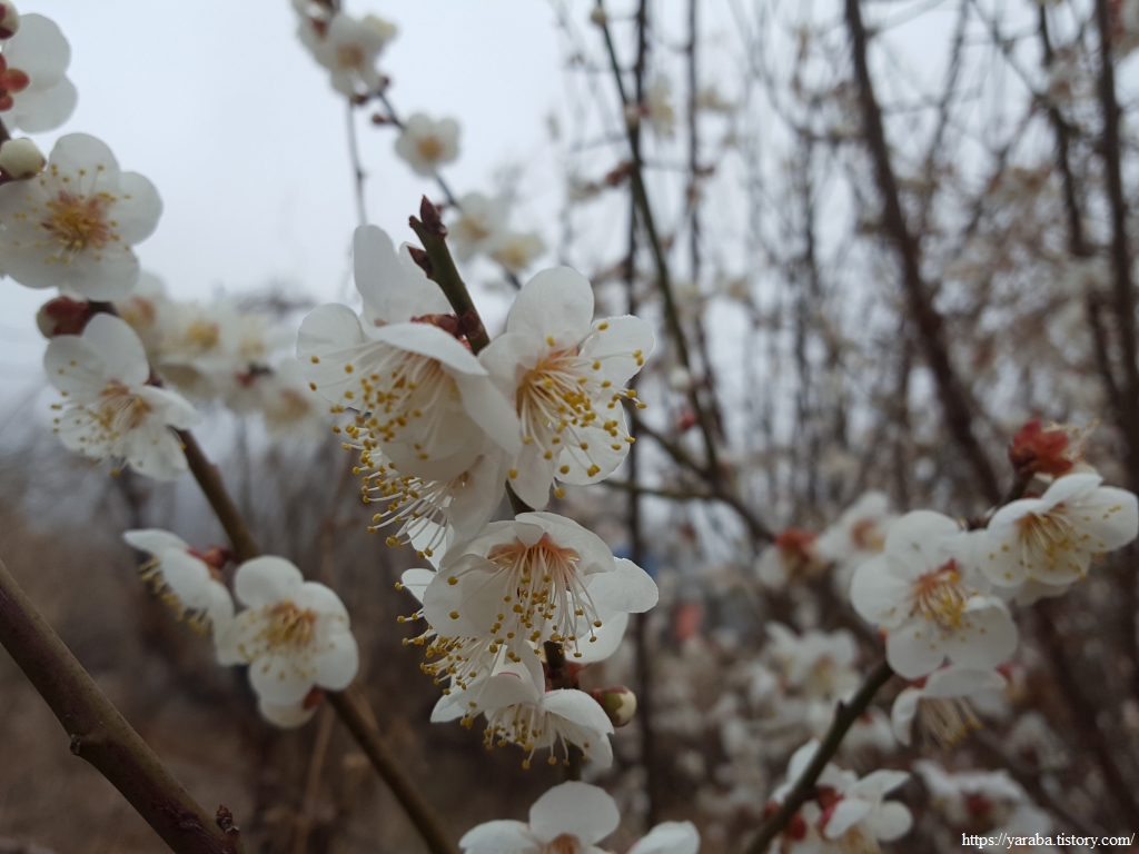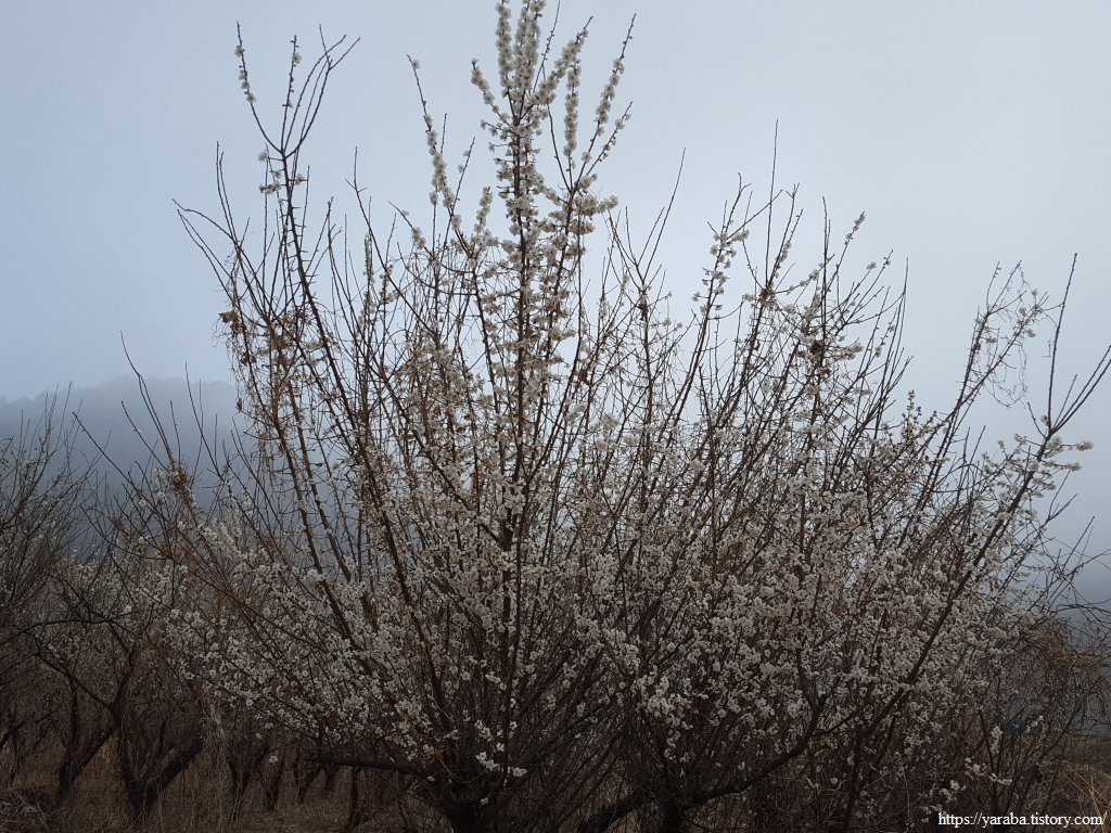 해무가 산까지 밀려와서 산봉우리가 보이지 않을 정도다. 그 와중에도 분주하게 봄을 맞이하고 있는 존재들이 우리의 마음을 깨운다. 매실나무가 하얀 드레스를 입었다.