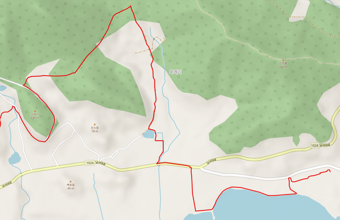 1024번 지방도 남서대로 도로변을 잠시 걷다가 개천 이후로 우회전하여 호구산을 향해 간다.