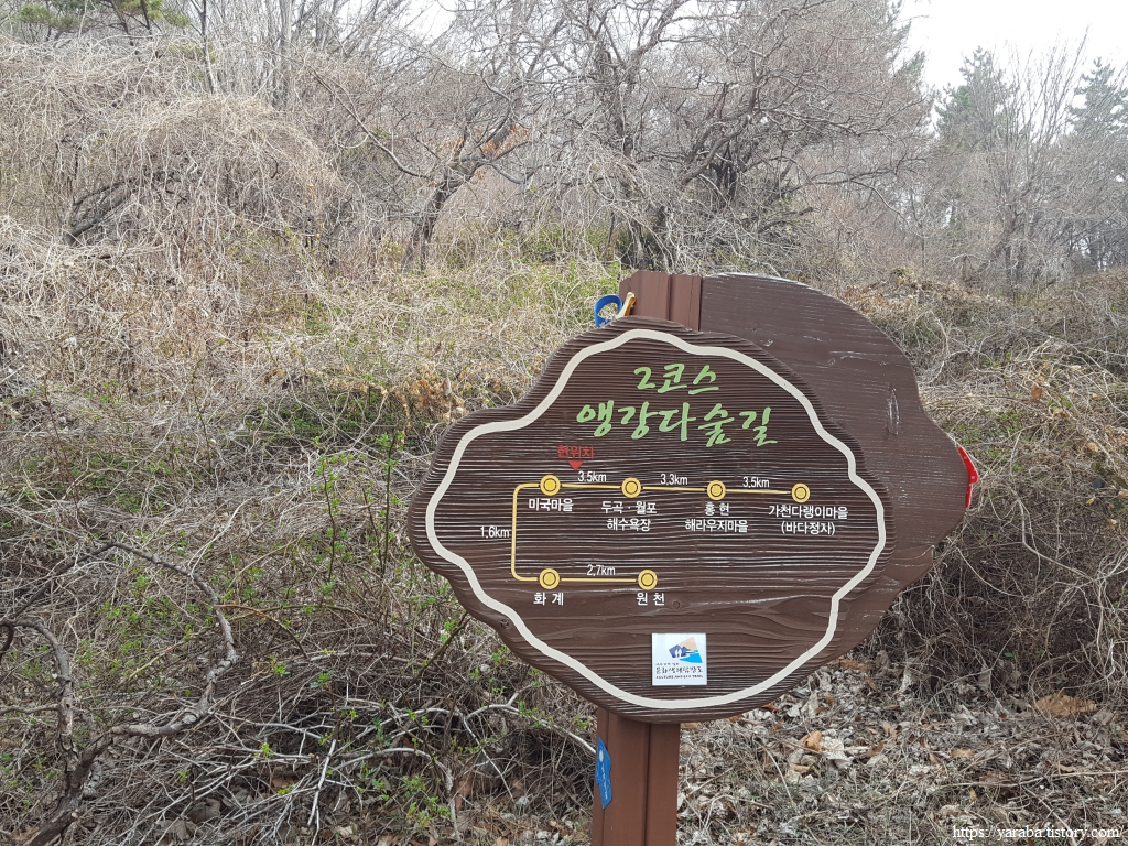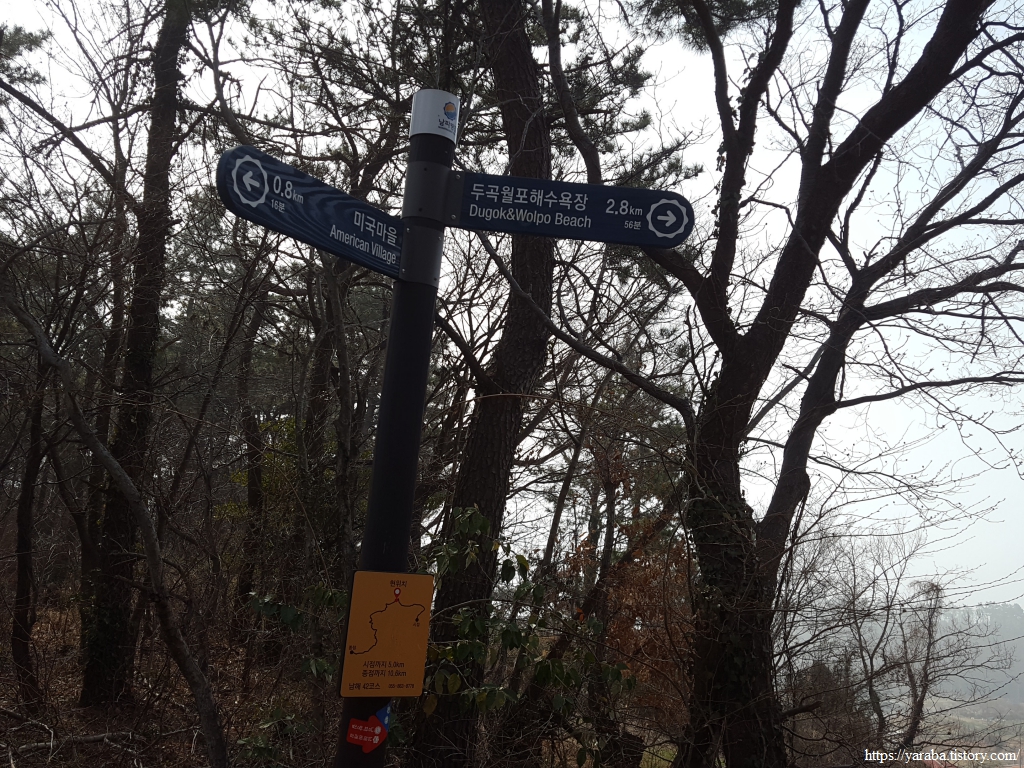남해 앵강 다숲길과 함께 하고 있는 남파랑길 42코스는 독특한 분위기의 미국 마을을 지나 임도와 숲길로 송등산 아랫 자락의 용소리를 걷는다. 남해군 이동면 용소리를 지나면 남면 당항리로 접어들면서 월포 해변에 닿는다.