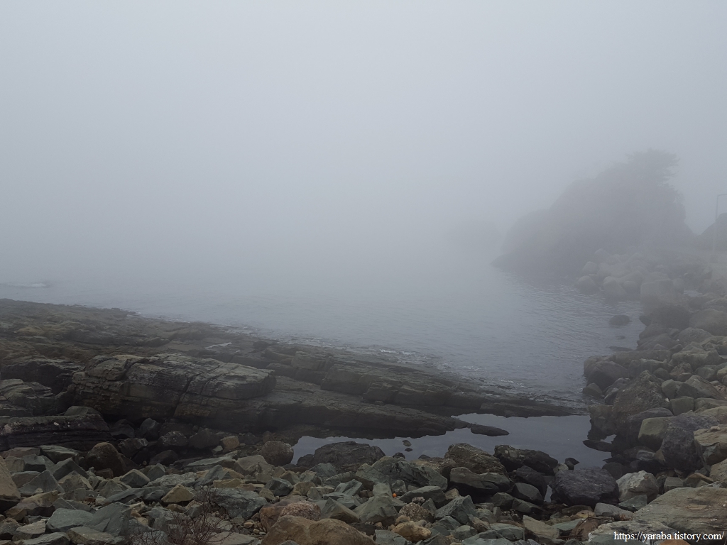 두곡 월포 해안으로 내려오니 산에서와는 다르게 칠흑 같은 해무가 시야를 가린다. 아무것도 보이지 않은 짙은 안갯속에서 당황스럽기도 했으나 어디서 이런 일을 경험해 보나! 하는 색다른 경험에 대한 기대감도 있었던 것은 사실이었다.