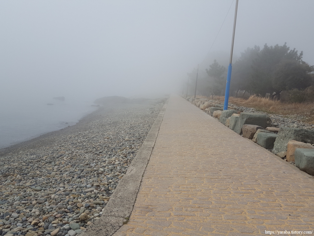 깔끔하게 정비된 해안 산책로를 걷는다. 올망졸망 몽돌 해안이 이어진다. 산책길로도 바다로도 시야가 뚫리지 않았지만 때로는 바로 앞만 보며 걷는 것도 나름의 의미가 있는 법이다.