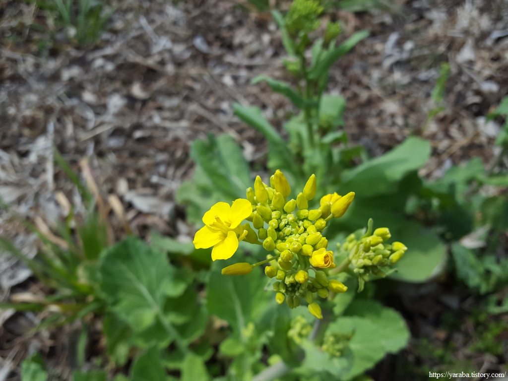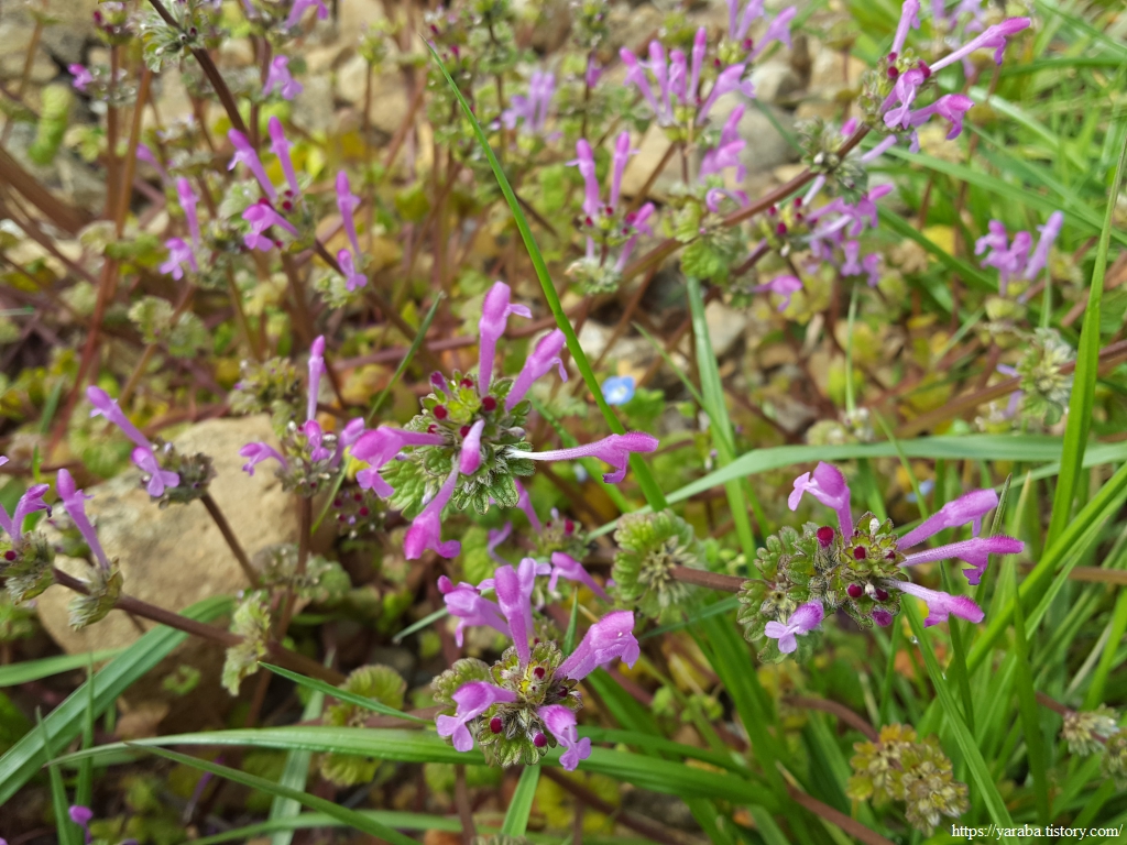 이건 무슨 꽃일까? 보라색 꽃이 새초롬하게 피었다. 두해살이 풀인 광대나물이다. 어린것은 나물로도 먹는다고 하는데 개인적으로 맛본 기억도 경험도 없다. 지혈제로도 쓰인다고 한다. 접골초와 같이 광대나물을 부르는 다른 이름들도 많은데 가장 재미있는 이름은 잎모양 때문에 붙은 코딱지나물이라는 이름이다.