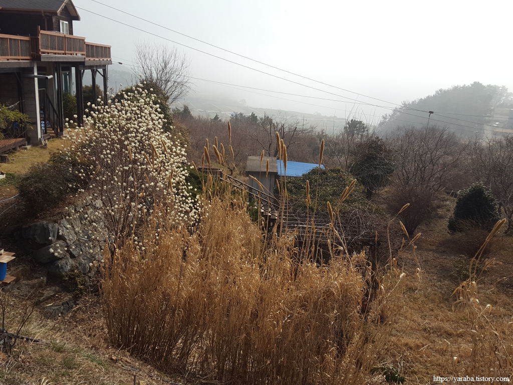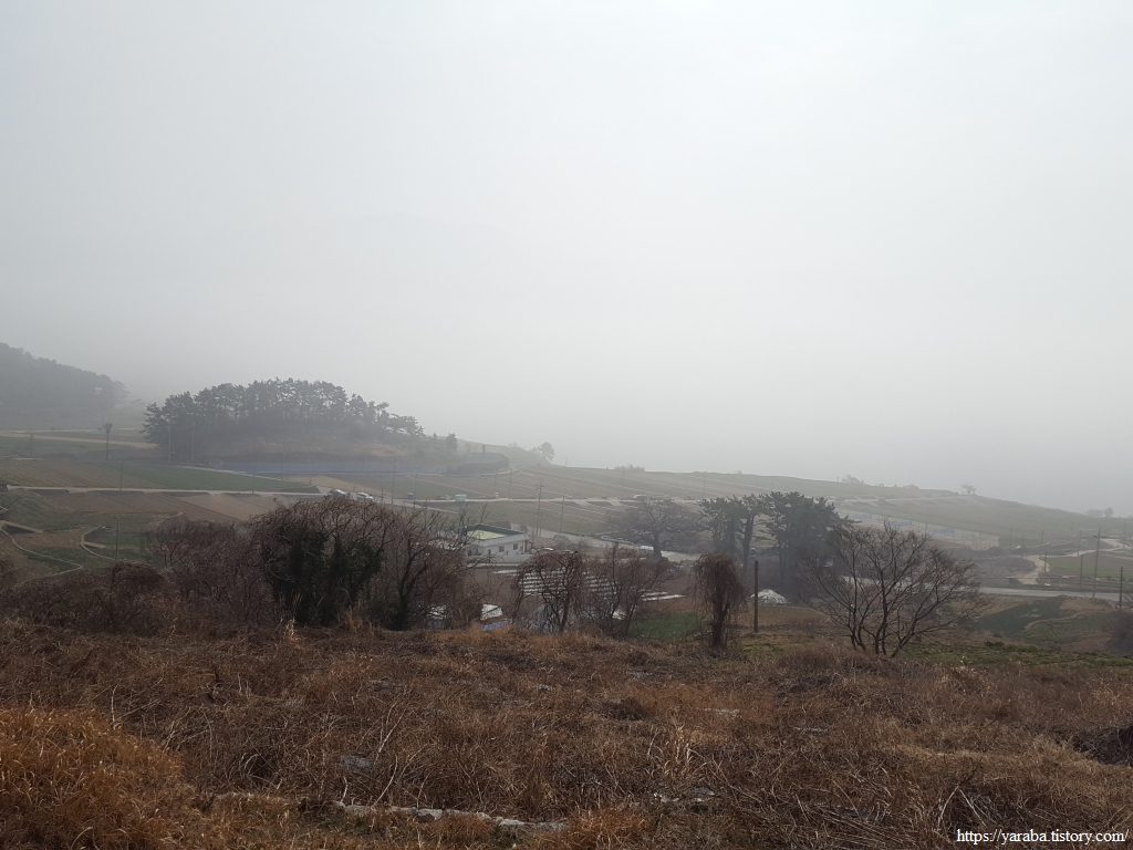 산 아래는 해무가 여전히 위세를 떨치고 있다. 산 아래로 넓게 펼쳐진 논밭들은 벌써 밭갈이를 끝냈다. 3월 초순에 남해는 벌써 농번기에 들어섰다.