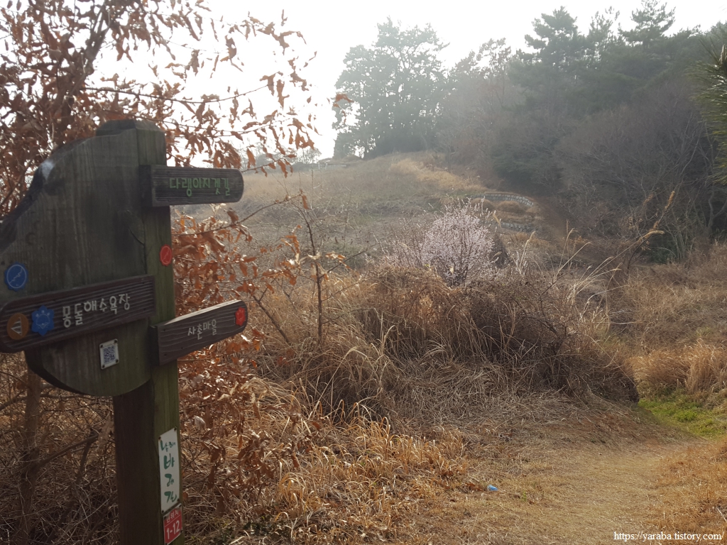 급한 경사를 내려오면 선구마을에서 내려온 도로와 만나서 사촌 해수욕장 입구로 이동한다.