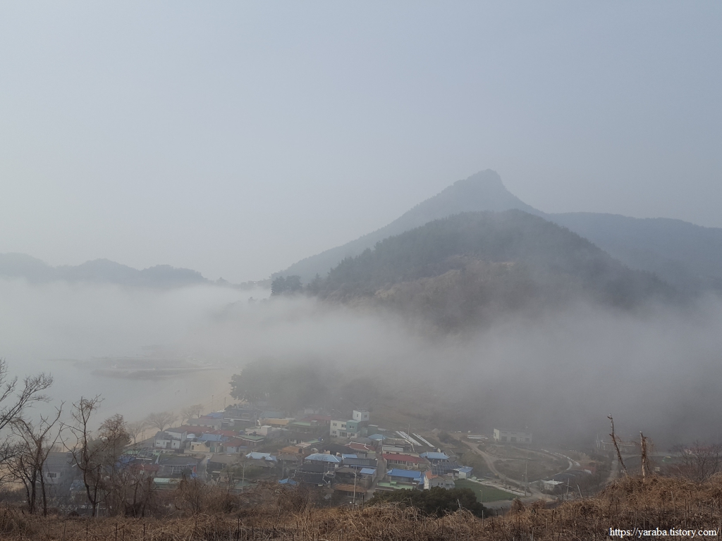 사촌 마을이 신선이 사는 마을인가! 싶을 정도의 광경이 펼쳐진다. 망기산과 고동산 아래로 해무가 구름처럼 자리하고 그 아래로 사촌 마을이 있으니 마치 머털도사 만화 속 풍경 같다.