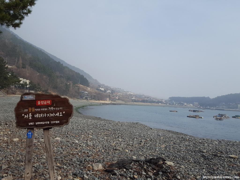 선구 마을 몽돌 해변에 세워진 애교 섞인 경고판에 미소 짓는다. "저를 데려가지 마세요"하는 말을 그 누가 거부할 수 있단 말인가?