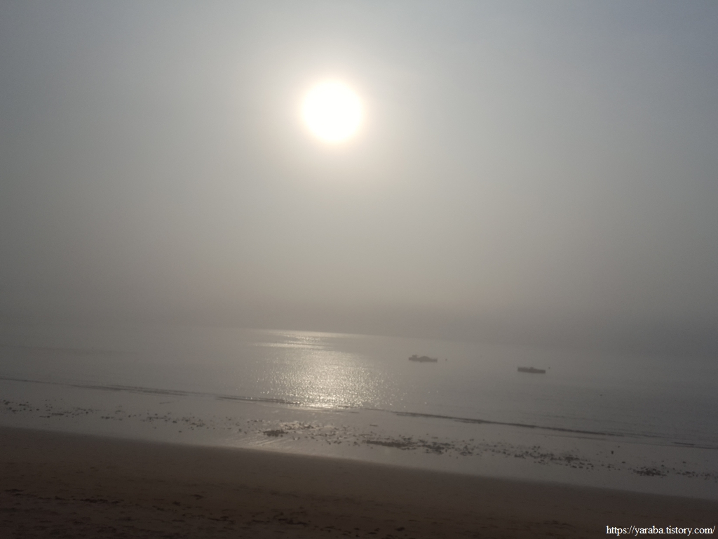 해무 가득한 사촌 해수욕장에서 우리가 만난 것은 강렬한 빛을 내뿜고 있지만 해무 때문에 눈이 부시지 않은 석양이었다.