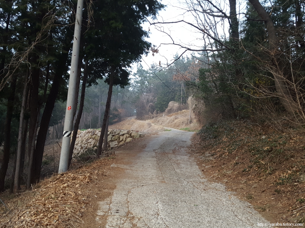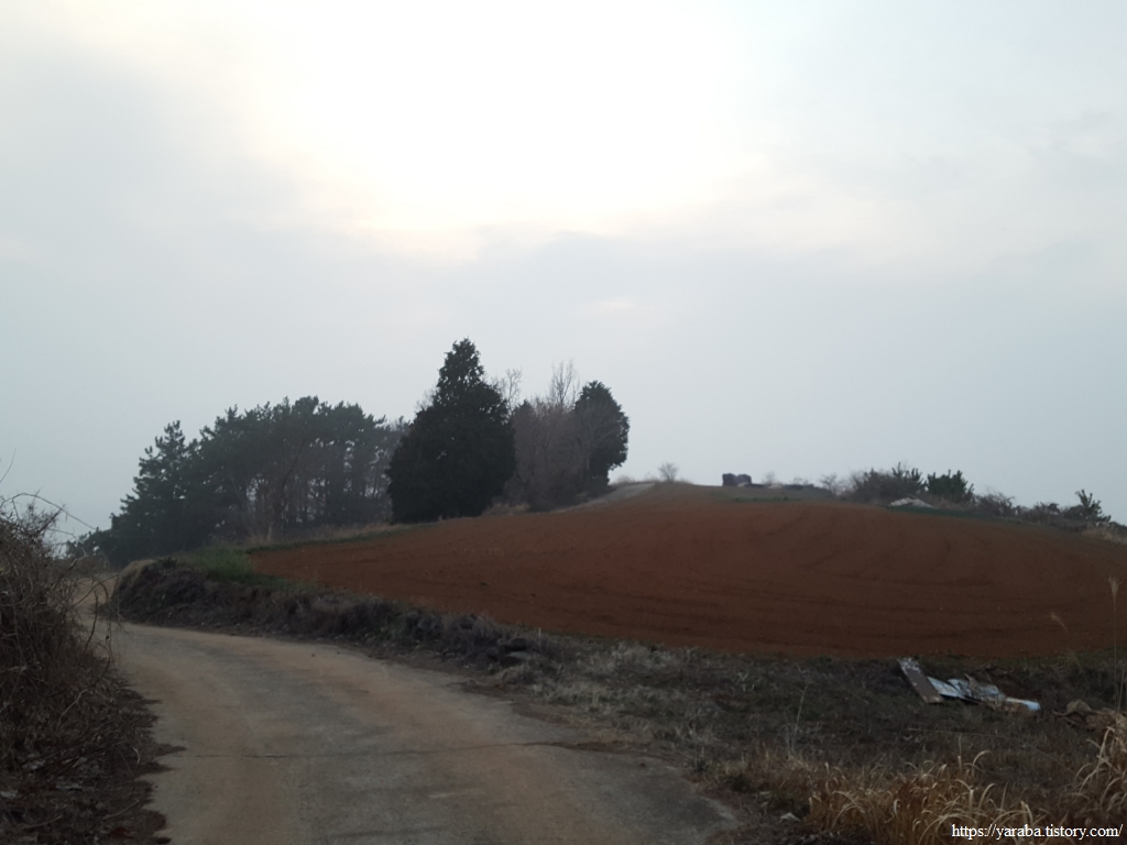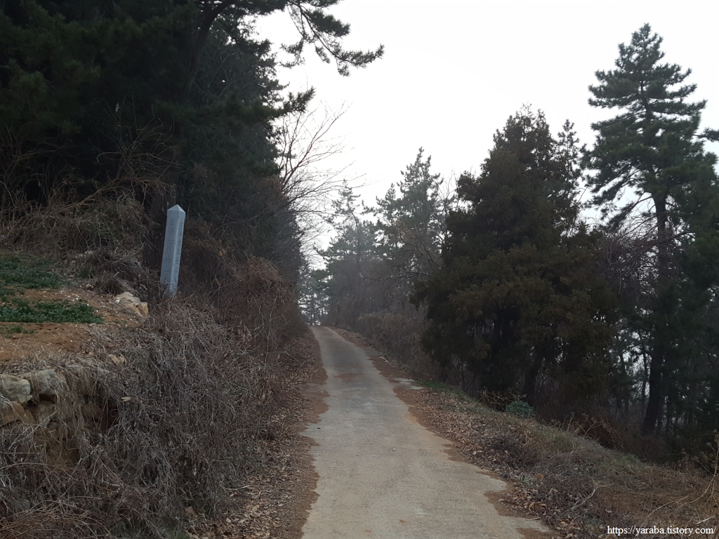 이런 길에는 농지도 있지만 어김없이 공동묘지도 나타나는 법, 특이하게 이곳에는 오벨리스크 모양으로 선산 입구라는 표지석을 세워 놓았다.